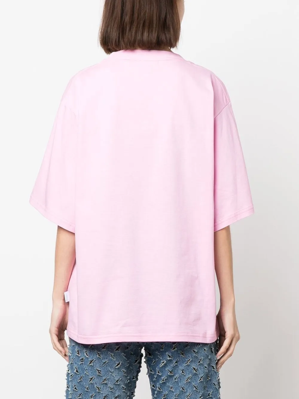 Розовый, разноцветный, хлопок, графичный принт спереди, круглый вырез, короткие рукава и прямой подол.