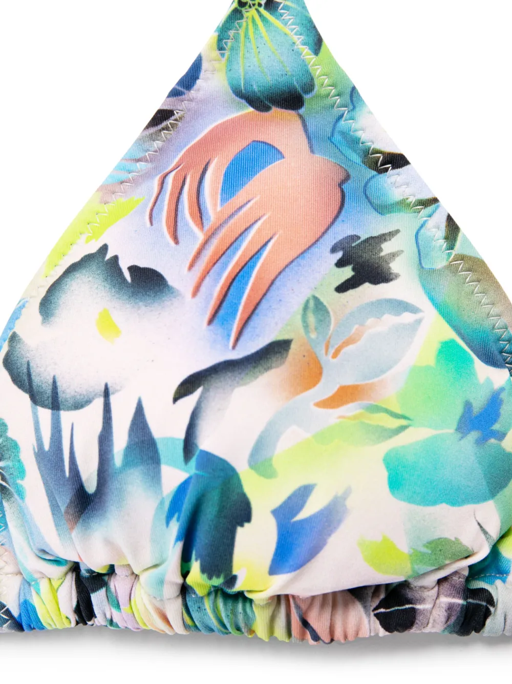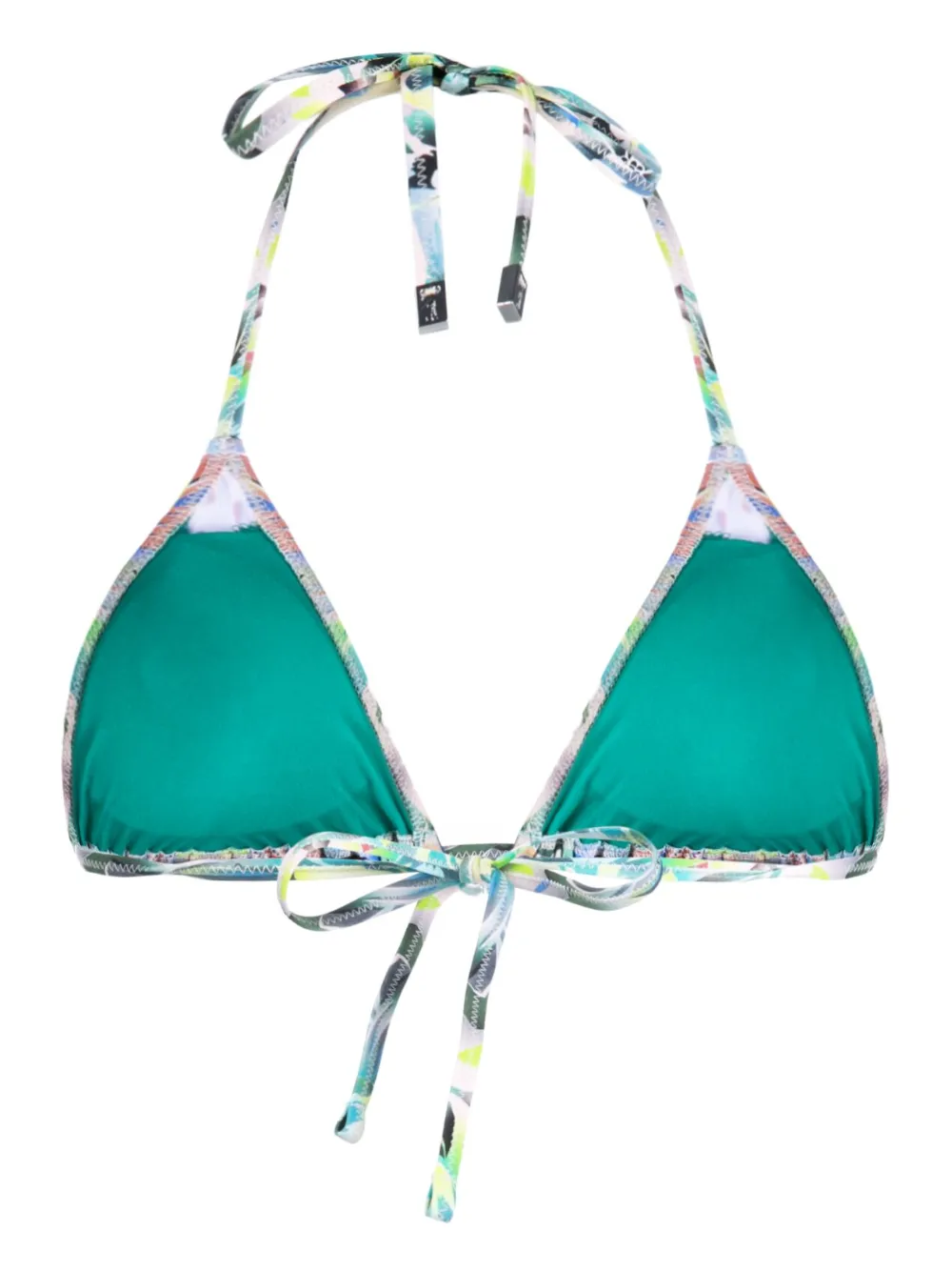 Белый/разноцветный, эластичный материал, сплошной графичный принт, треугольная чашка, завязки вокруг шеи и застежка на завязке сзади. Пожалуйста, примеряйте купальники и пляжные шорты только поверх собственного белья.