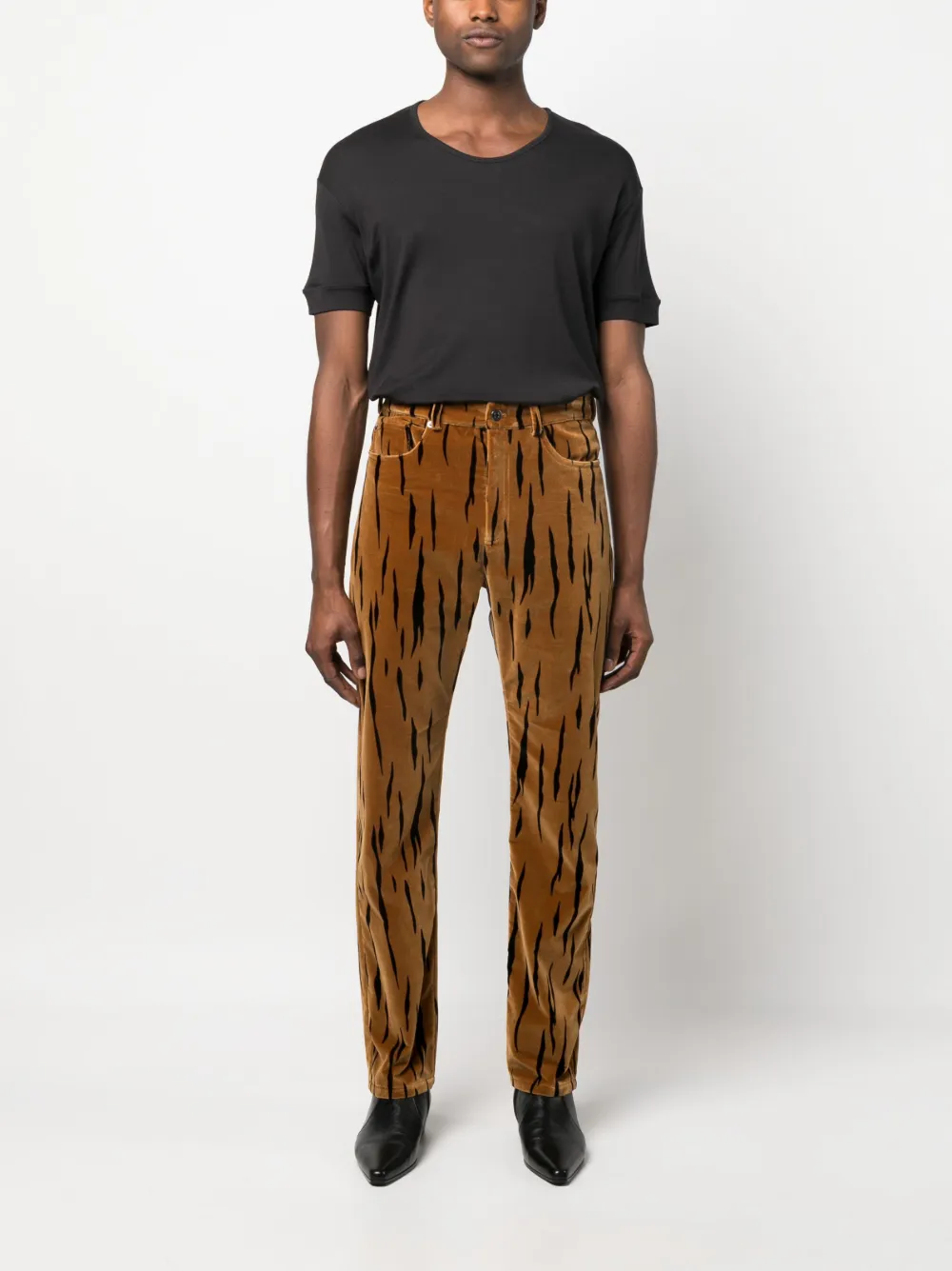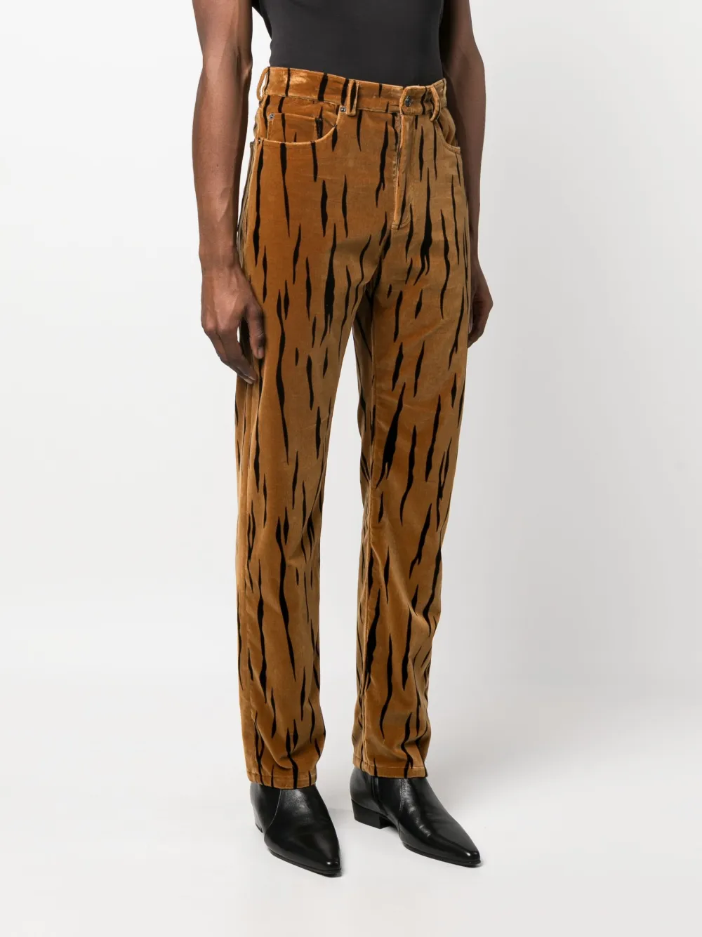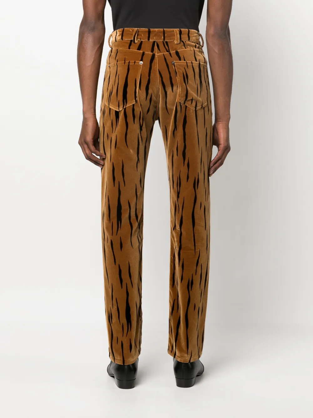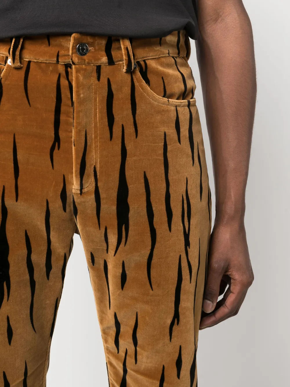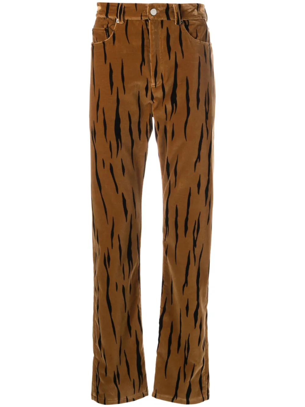 Бархат, принт с изображением тигра, петли для ремня, застежка на молнии и пуговице спереди, пять карманов и прямой крой.