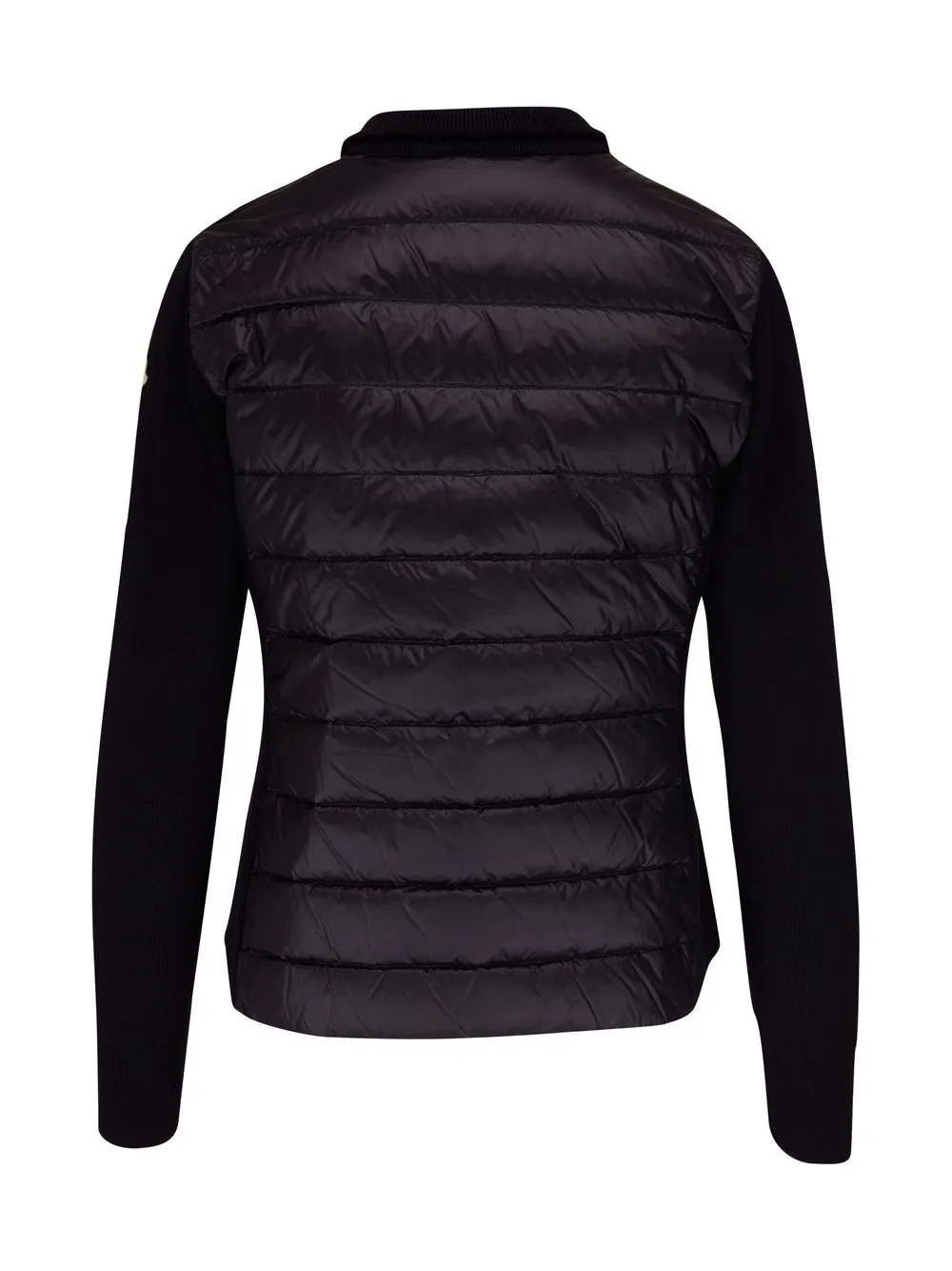 Черный, необработанная шерсть, наполнитель из пуха и перьев, дутые вставки, нашивка с логотипом на рукаве, воротник-труба, длинные рукава, отделка в рубчик и застежка на молнии спереди.