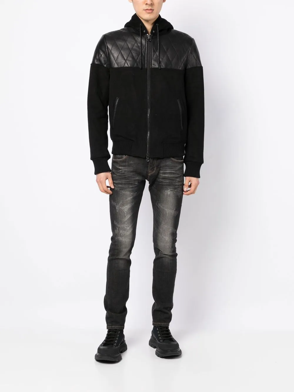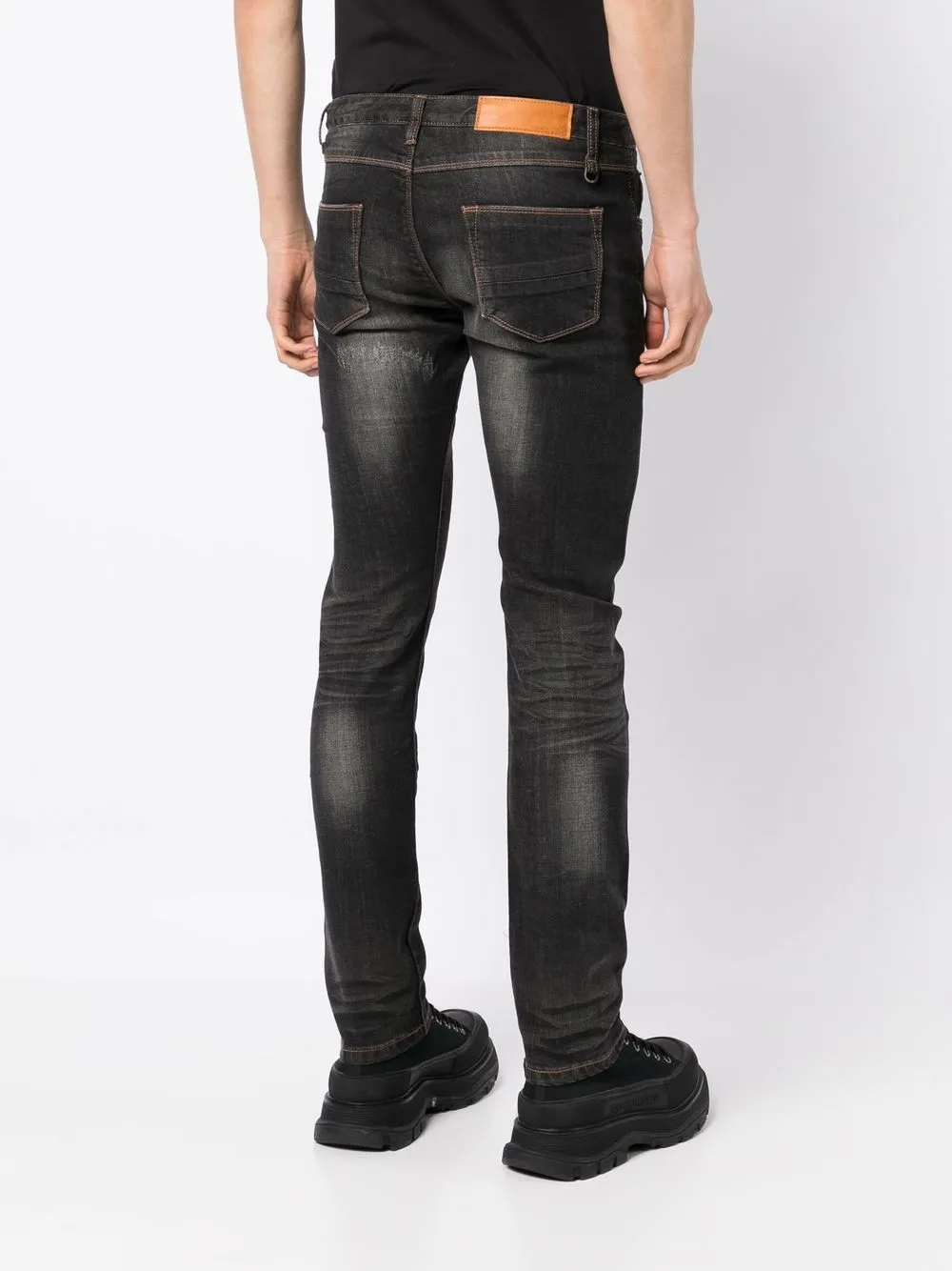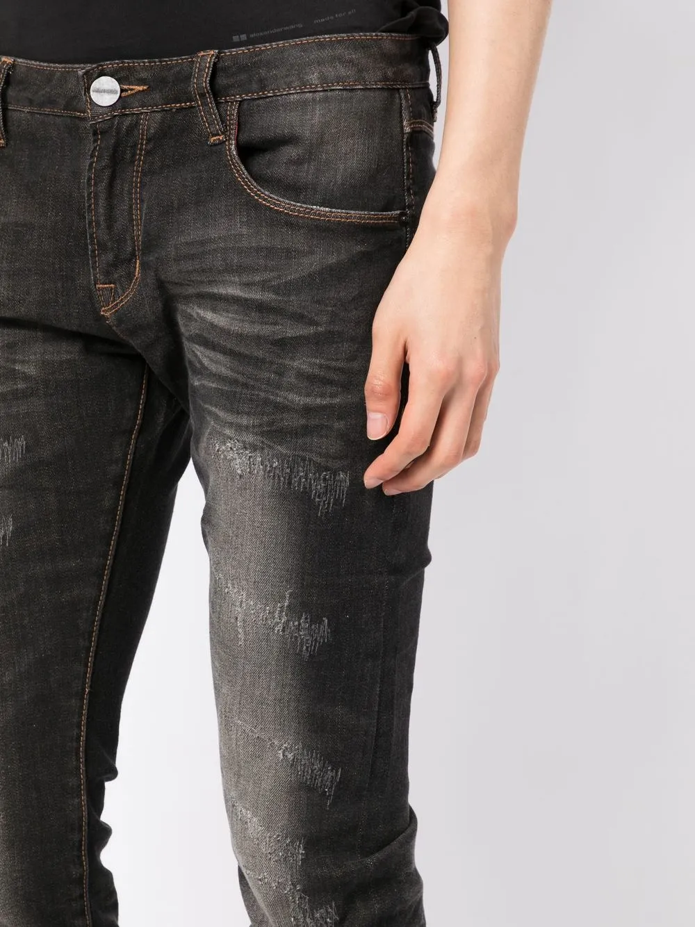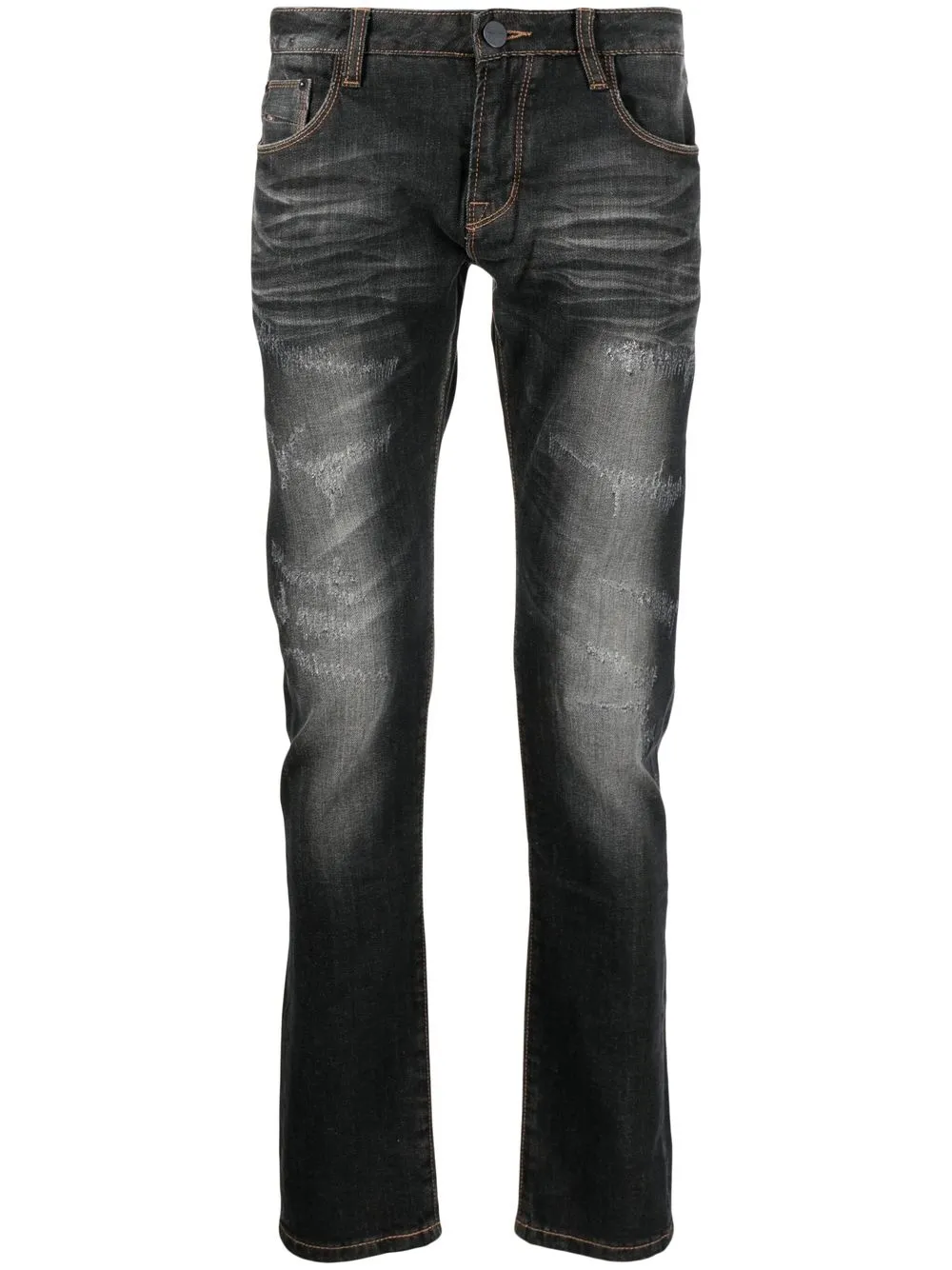 Темно-серый, эластичный хлопок, эффект потертости, эффект потертости, нашивка с логотипом сзади, застежка на молнии и пуговице спереди, петли для ремня, пять карманов и облегающий крой.