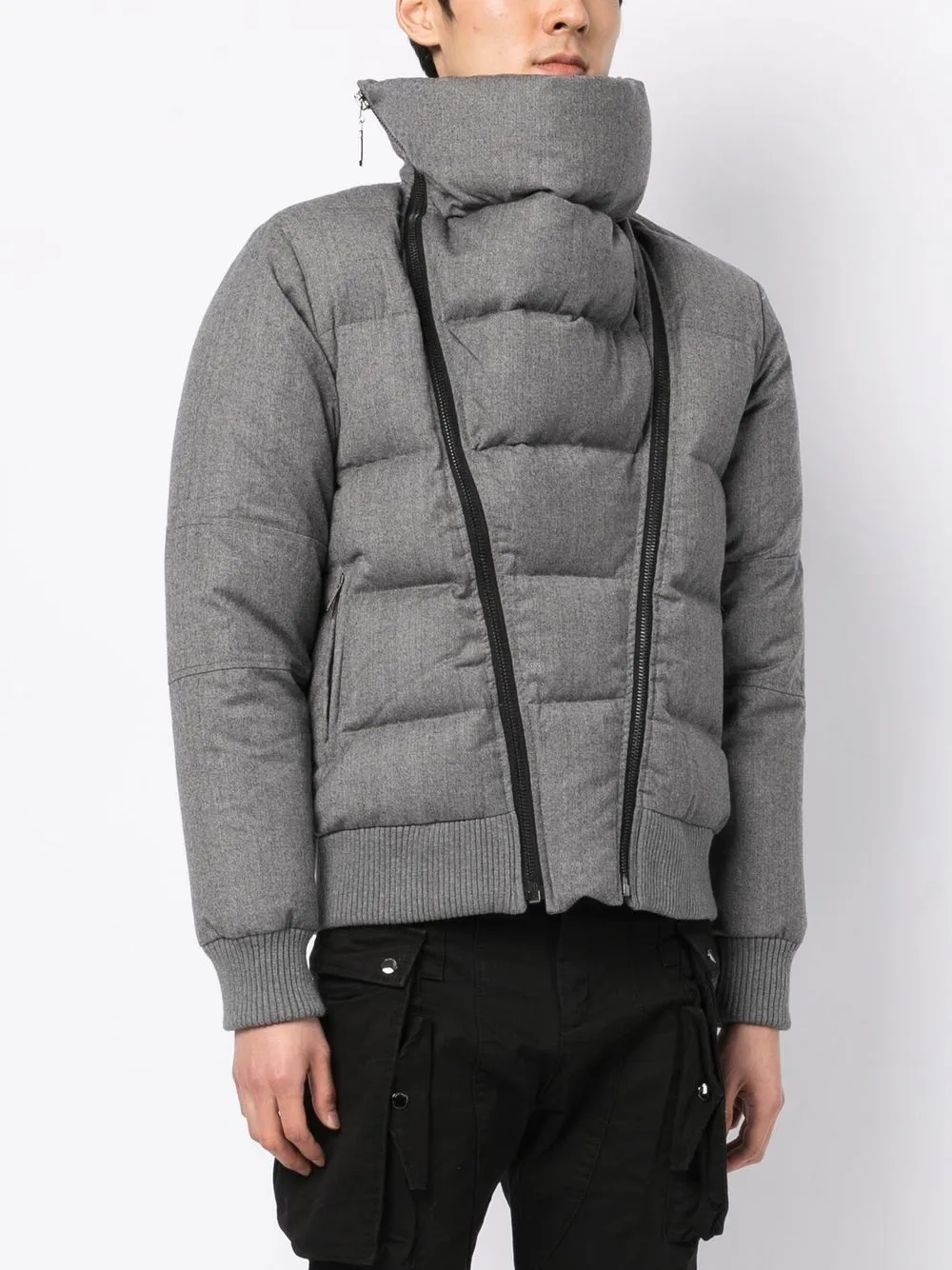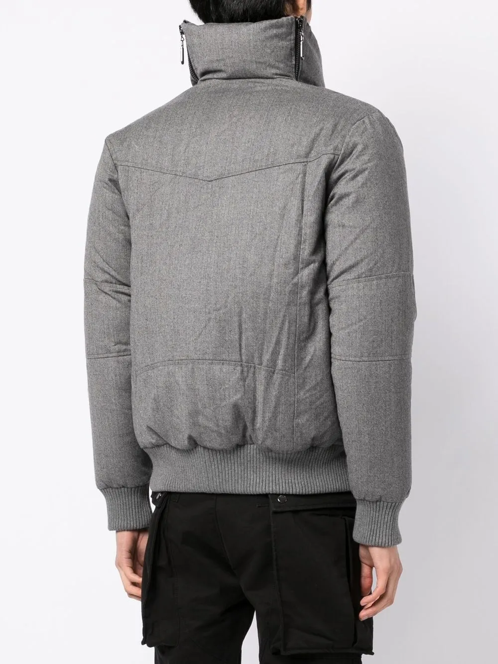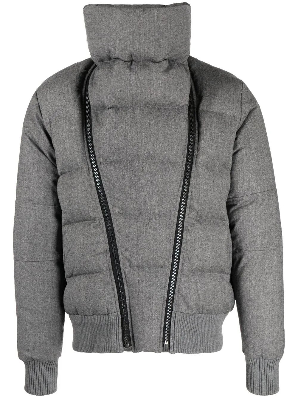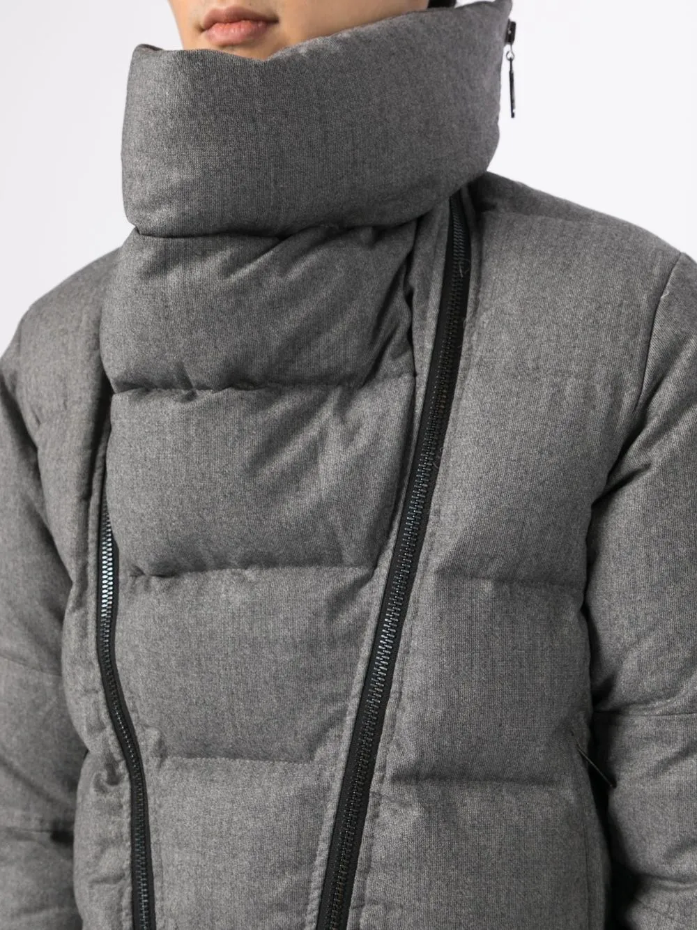 Серый, шерсть, дутый материал, воротник-стойка, съемный воротник, застежка на молнии спереди и длинные рукава.