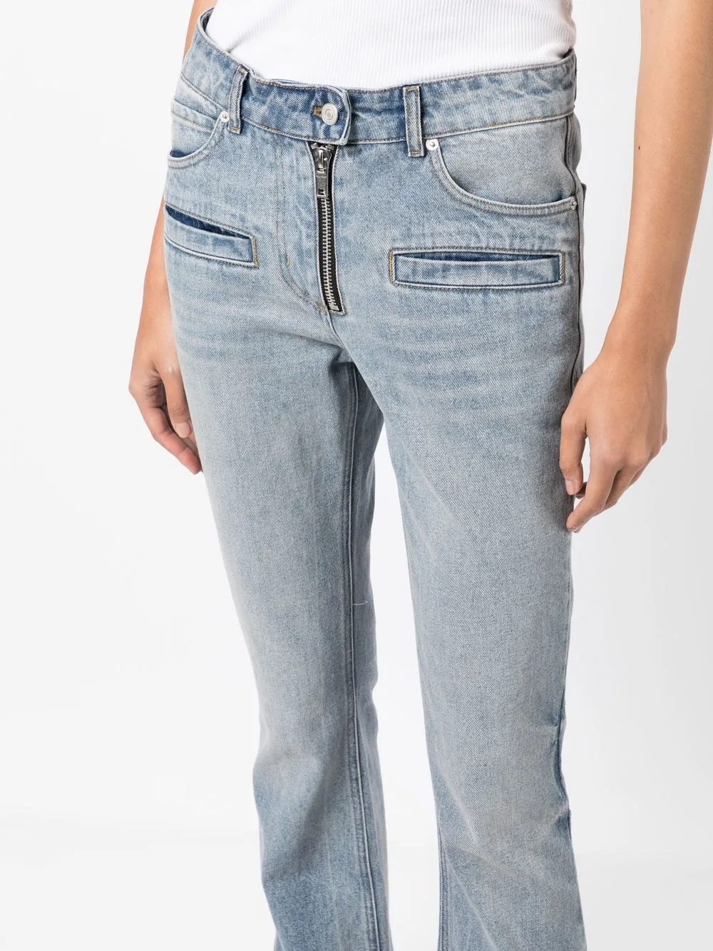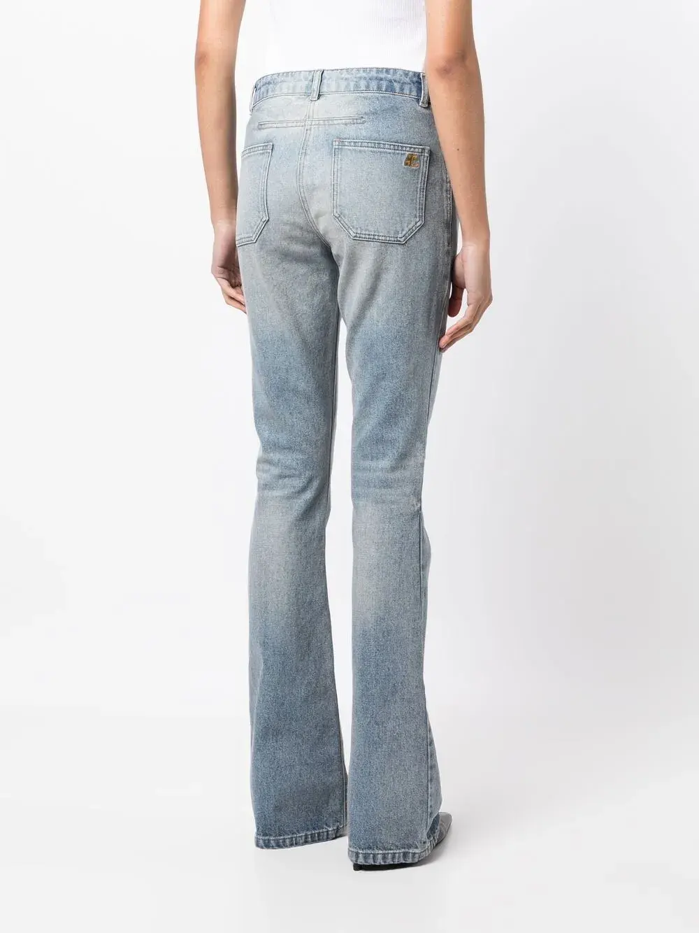 Голубой, хлопок, обработанный деним, вышитый логотип сзади, пять карманов, два передних кармана с листочкой, застежка на молнии и пуговице спереди, петли для ремня, средняя посадка и расклешенный крой.