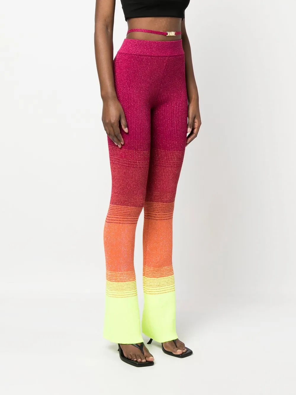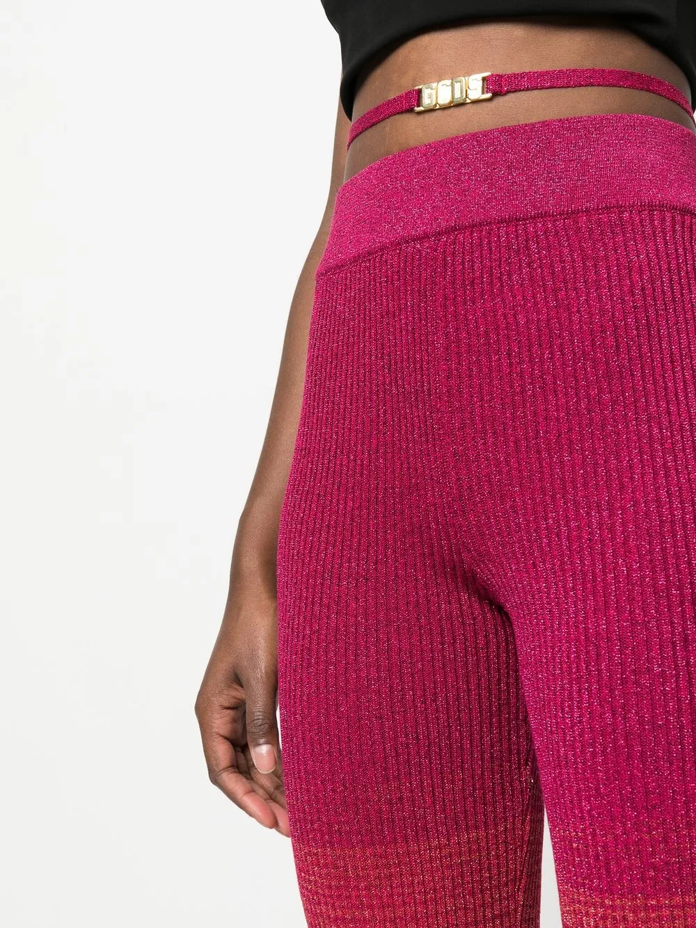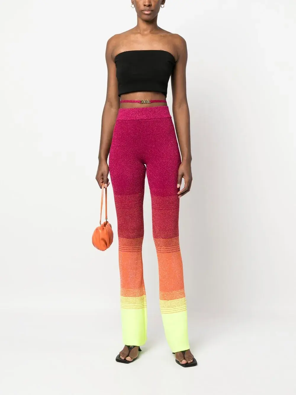 Фуксия, оранжевый, желтый цитрон, трикотаж в рубчик, эффект потертости, золотистый металлический логотип, завышенная талия и расклешенный крой.