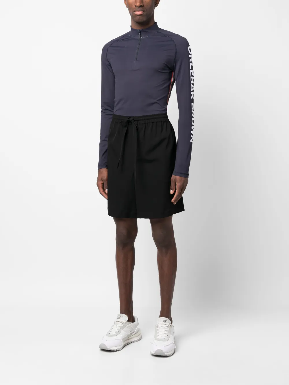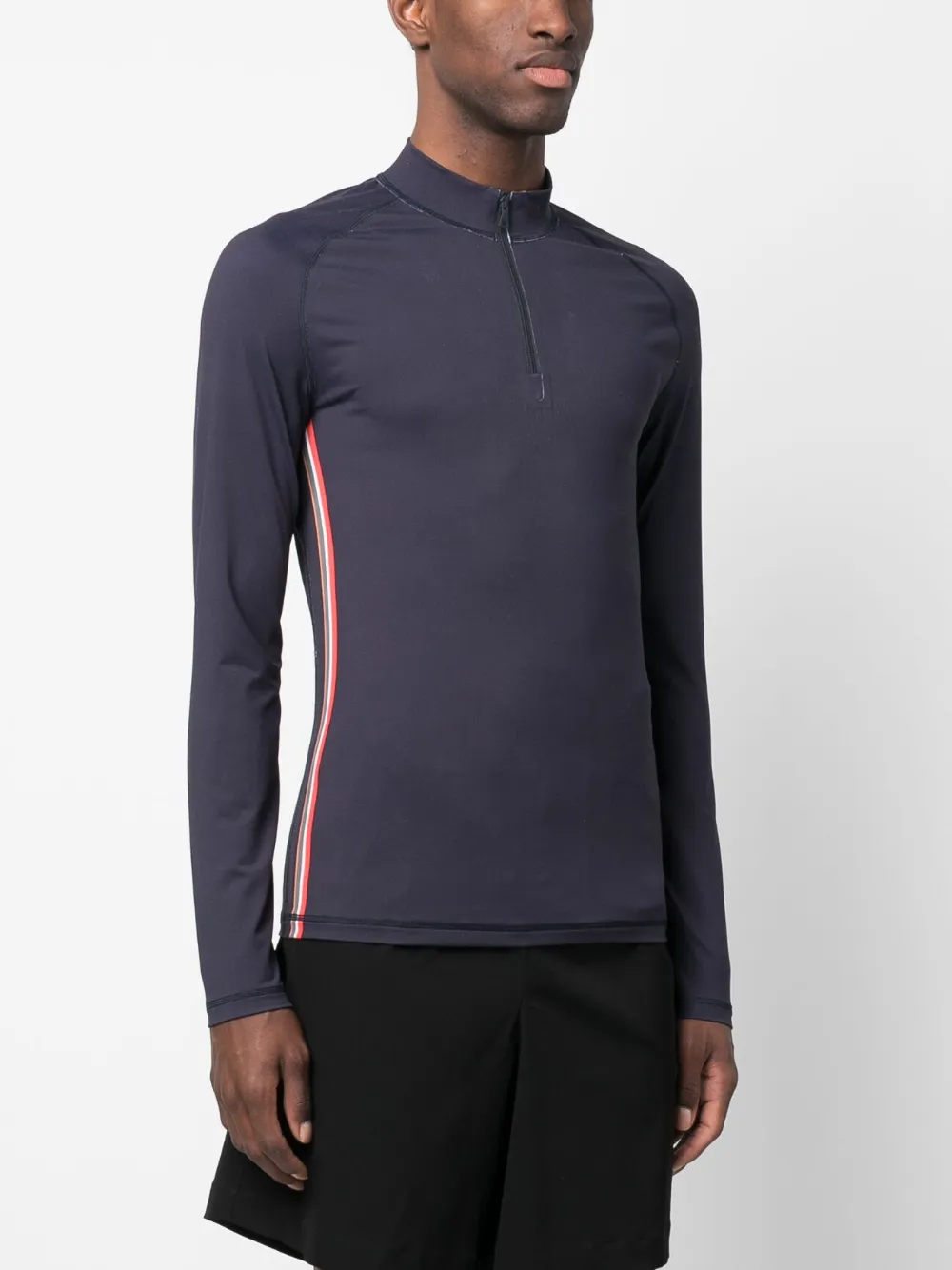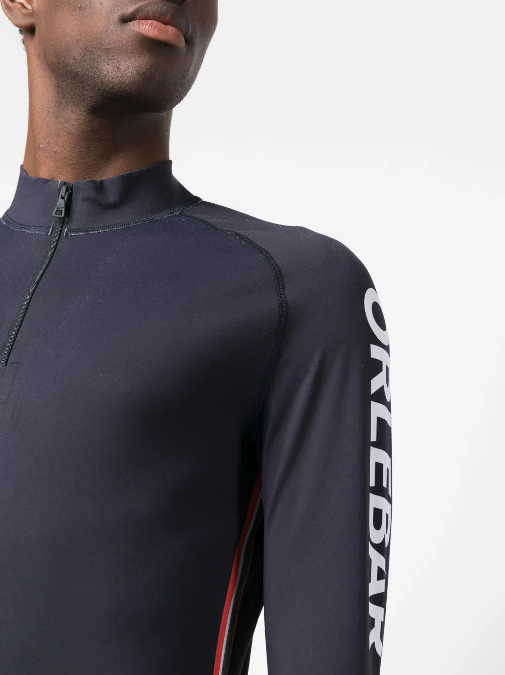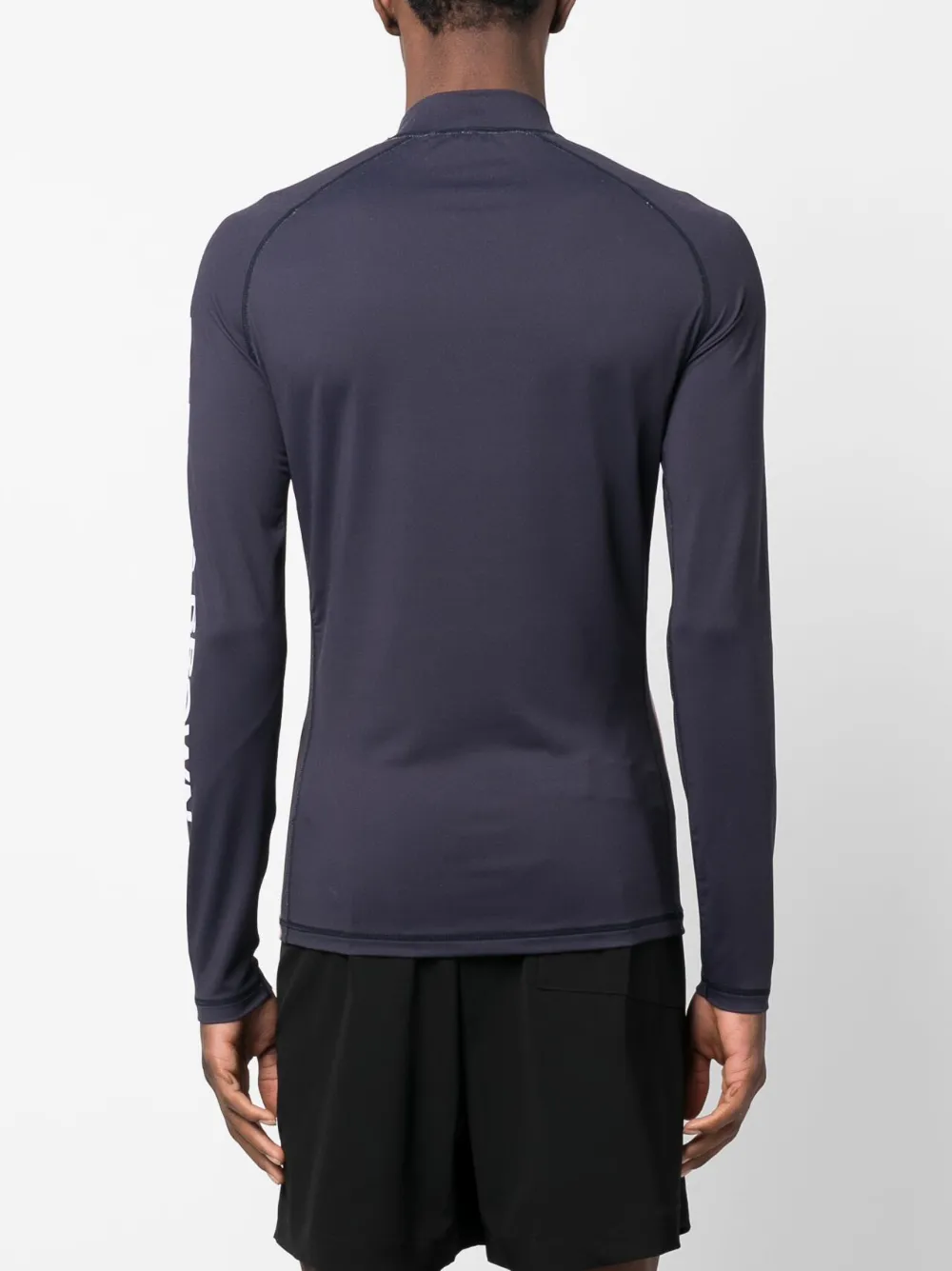 Темно-синий, эластичный материал, принт с логотипом на рукаве, высокий воротник, закругленный подол и длинные рукава.