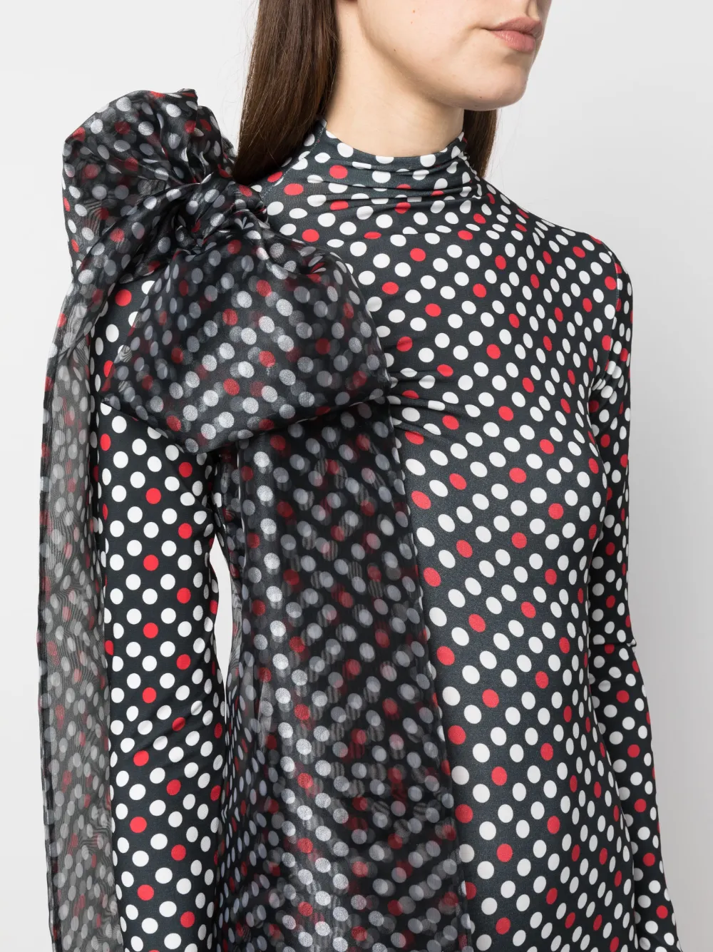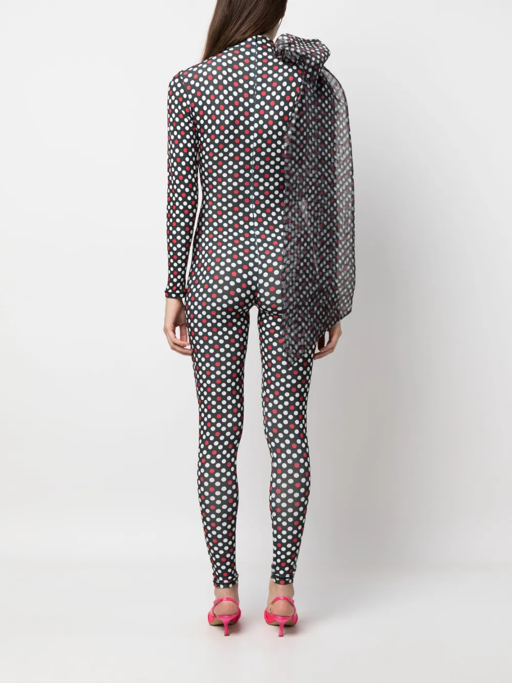 Черный/белый, красный, эластичный материал, принт в горох, бант, потайная застежка на молнии сзади, длинные рукава и облегающий крой.