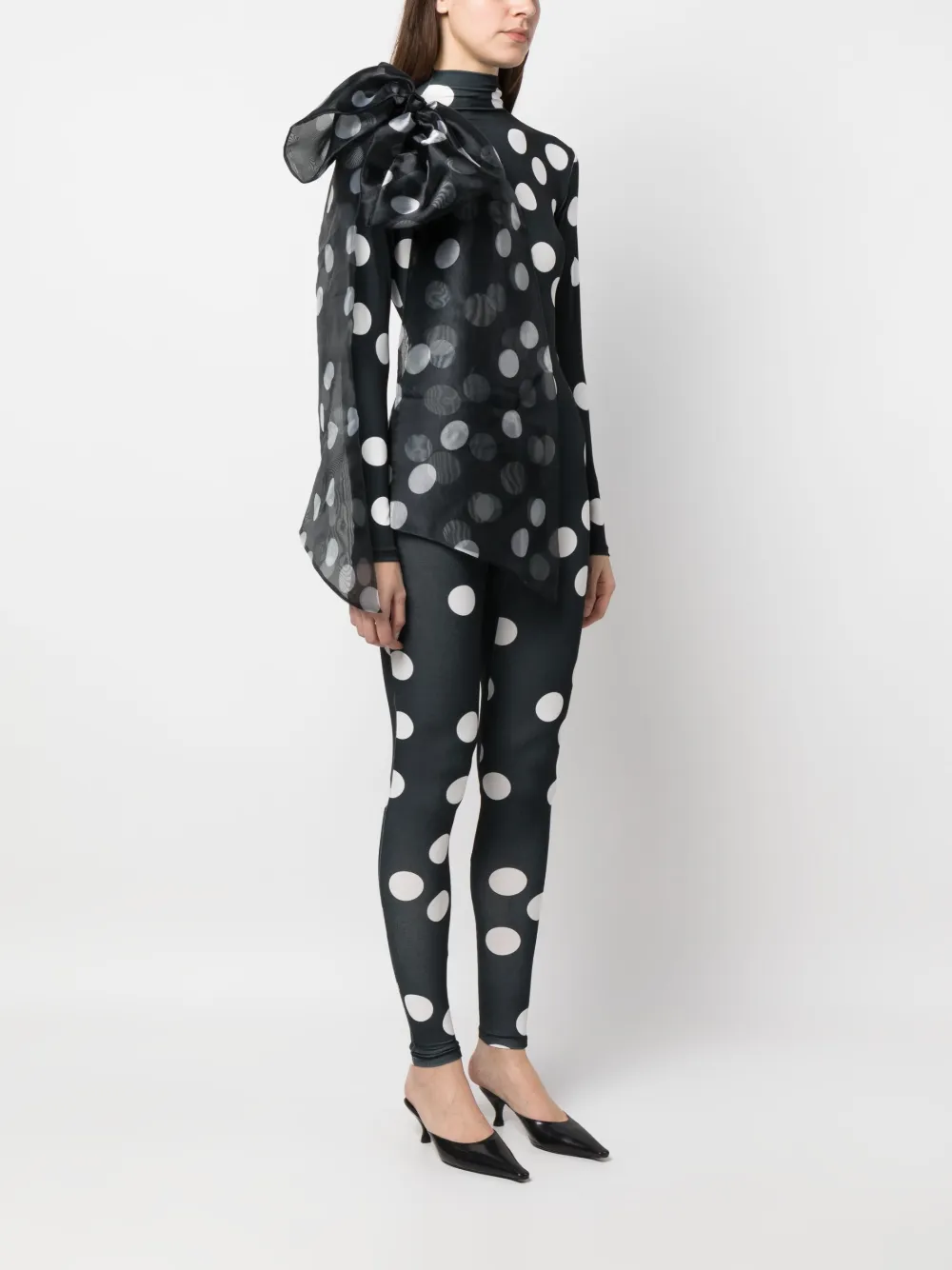 Черный/белый, бант, принт в горох, высокий воротник, длинные рукава, потайная застежка на молнии сзади и облегающий крой.