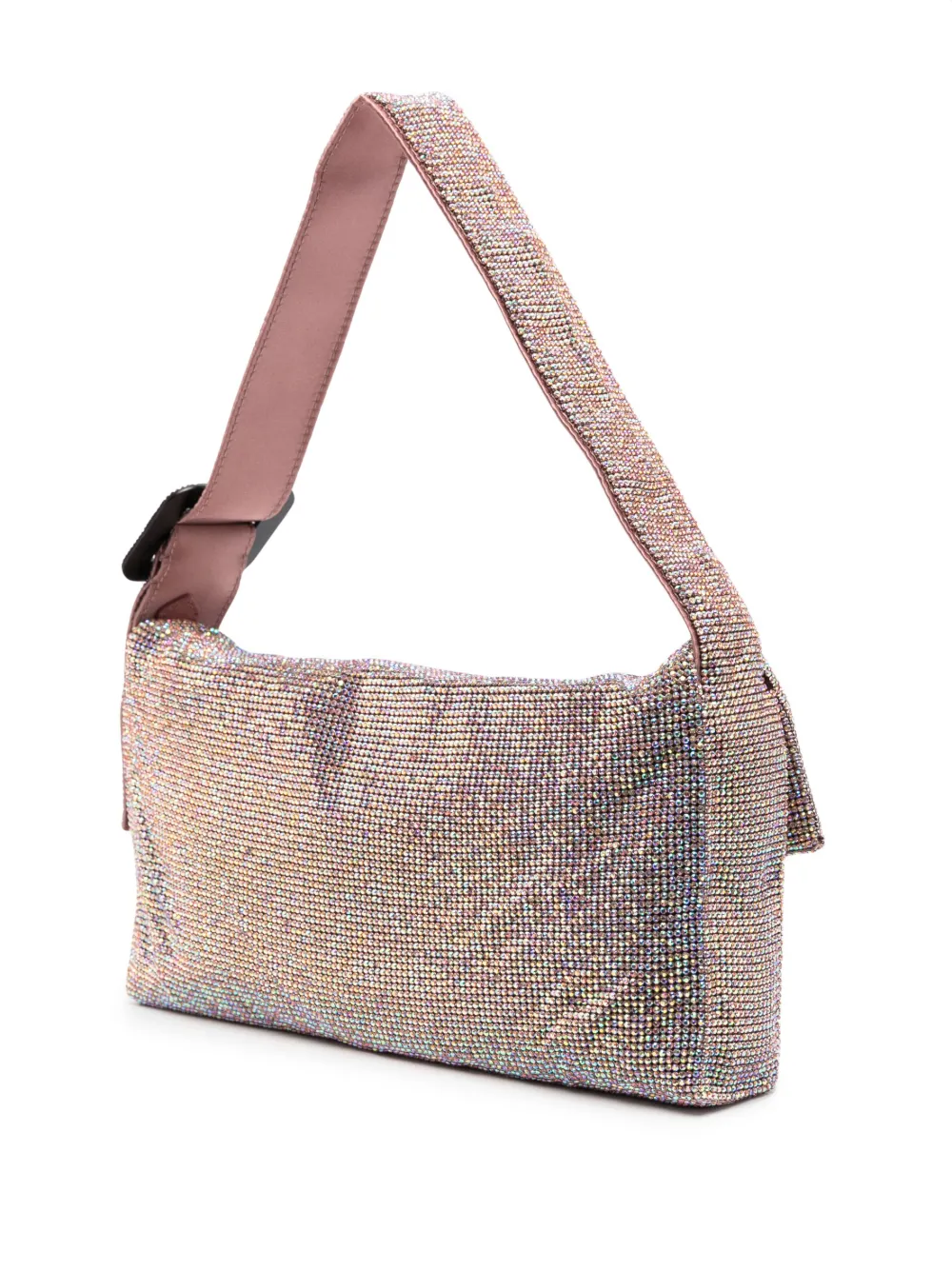 Розовый, шелковый атлас, декор из кристаллов, нашивка с логотипом внутри, прямоугольная форма, застежка на молнии сверху, регулируемый ремень на плечо и внутренние накладные карманы.