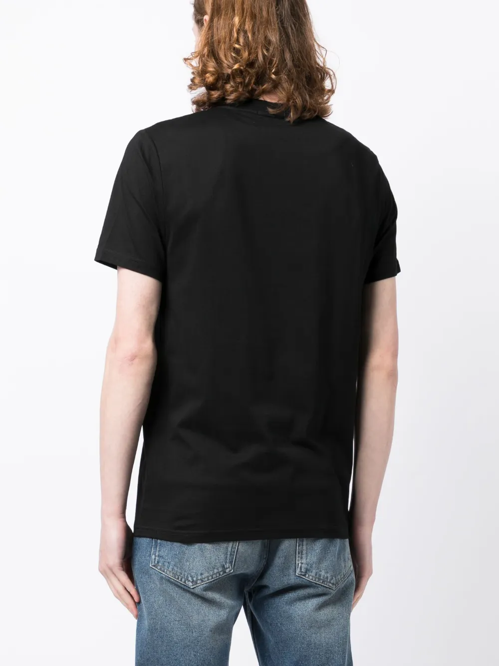 Черный, хлопок, вышитый логотип спереди, круглый вырез, короткие рукава и прямой подол.