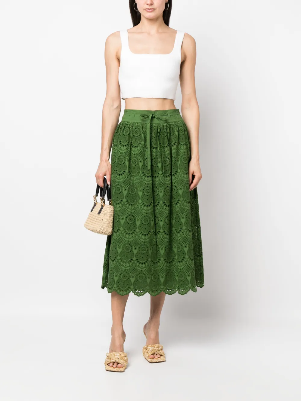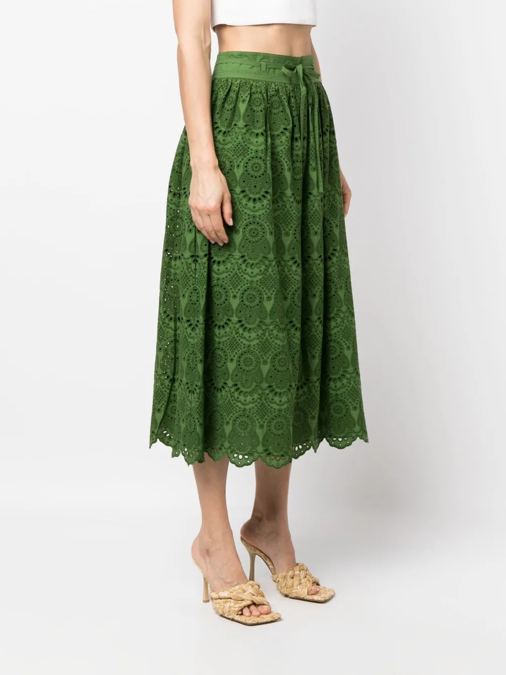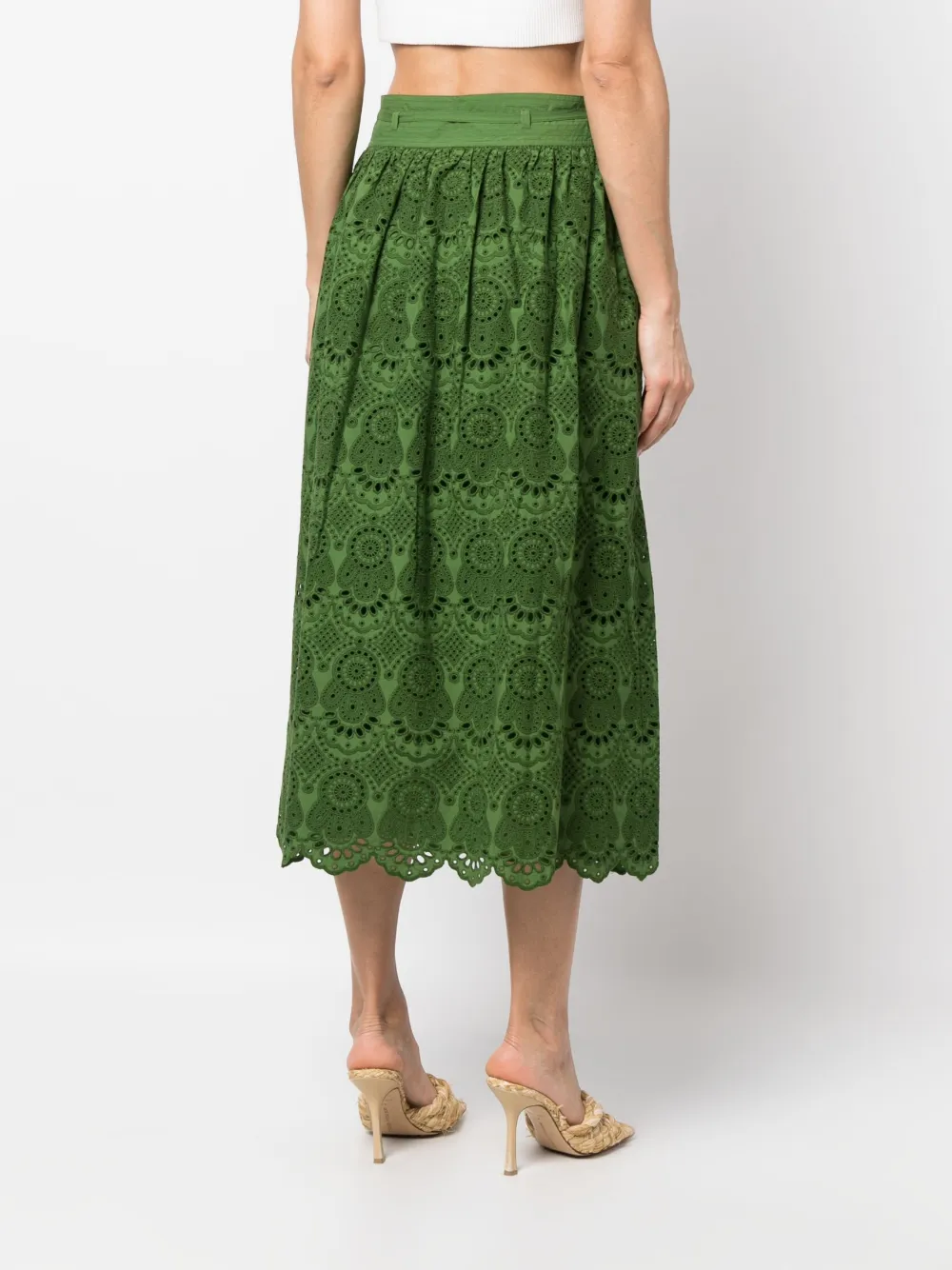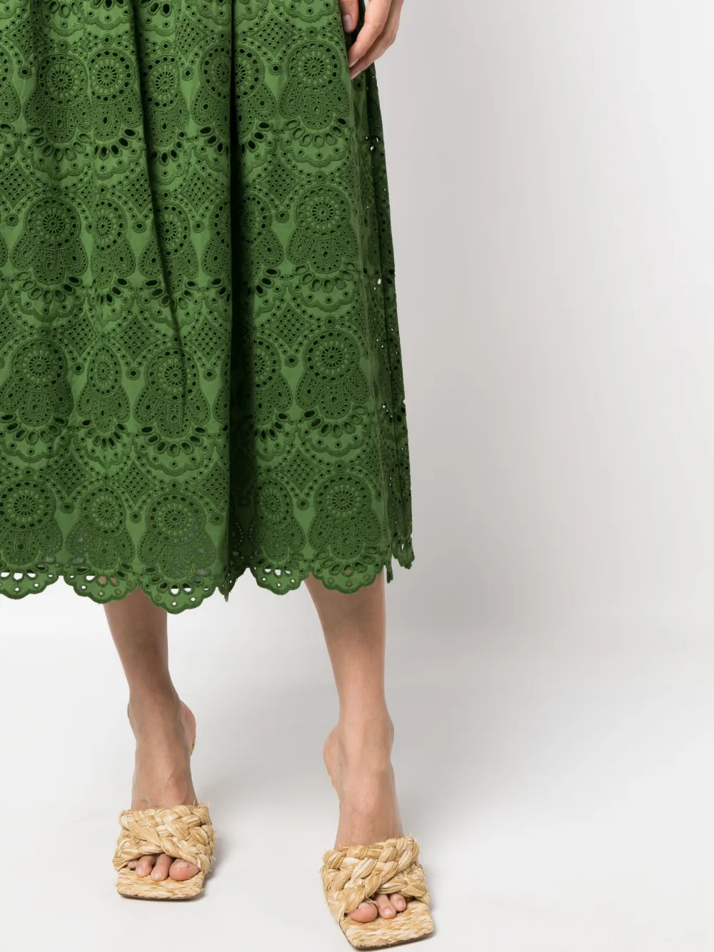 Зеленый, хлопок, люверсы, перфорация, завышенная талия, ремень на талии, потайная застежка на молнии сбоку, подол с фестонами и длина до середины голени.