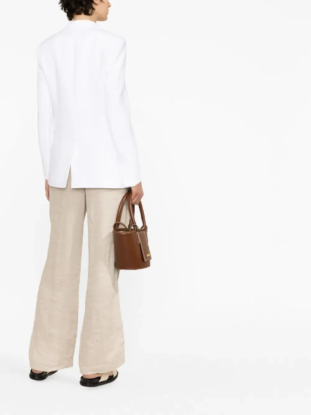 Белый, смесовый лен, шелковая подкладка, зазубренные лацканы, подплечники, застежка на пуговицах спереди, два передних кармана с клапанами, длинные рукава, манжеты на пуговицах, шлица по центру сзади и прямой подол.