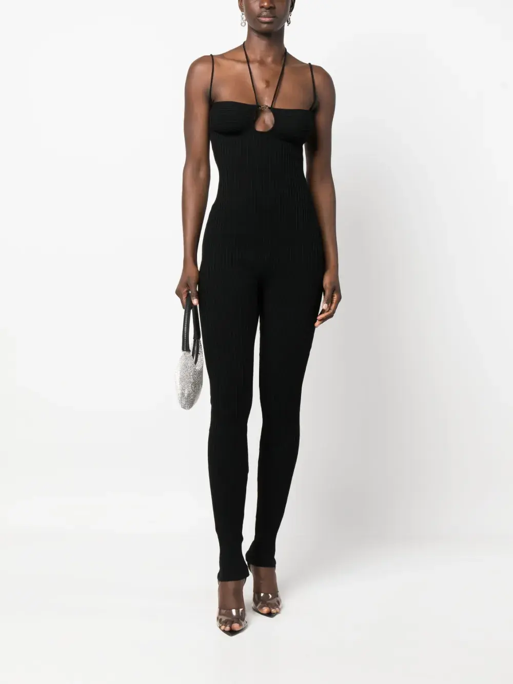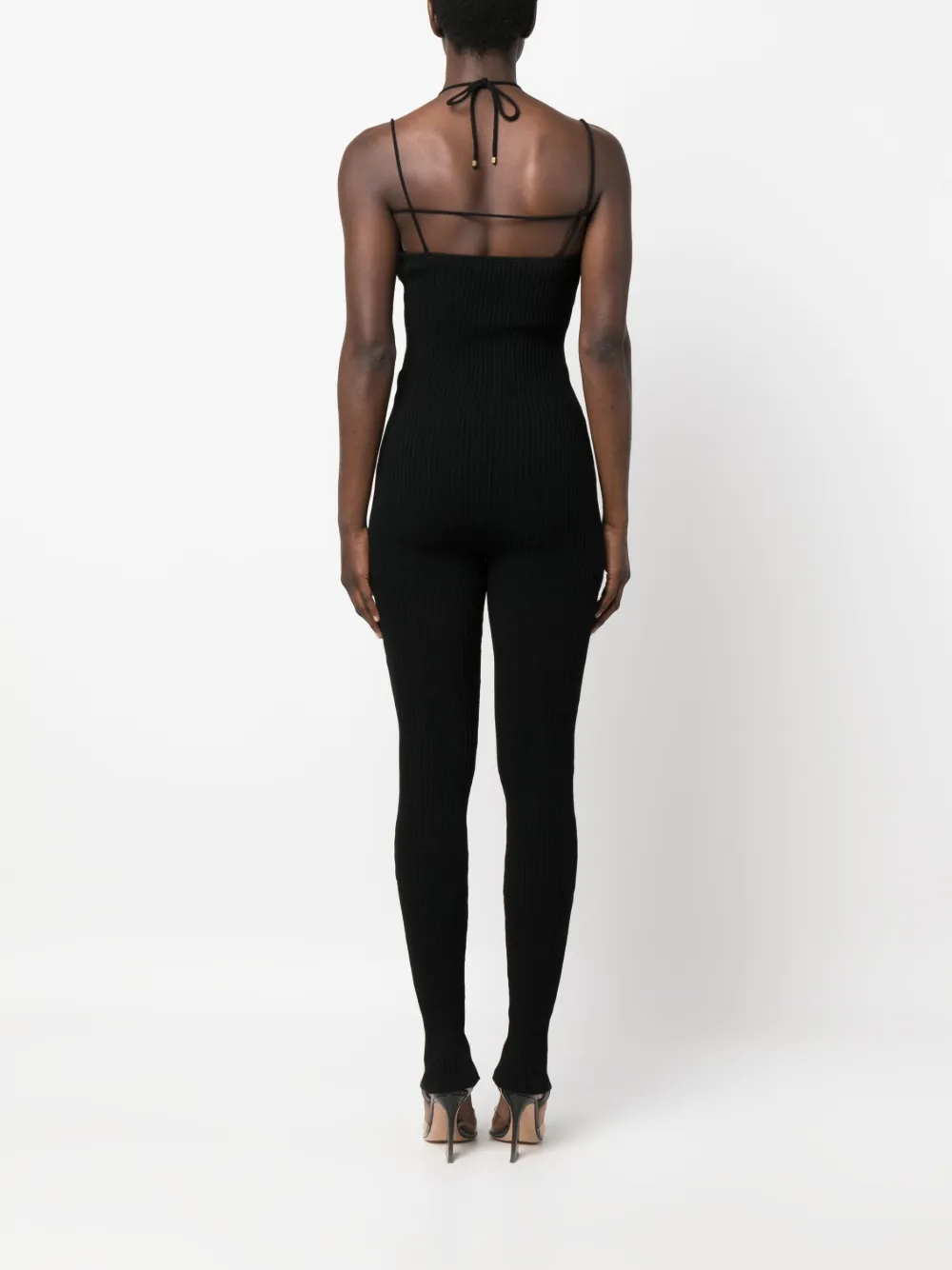 Черный, трикотаж в рубчик, слитная модель, вырезные детали, тонкие бретели, завязки вокруг шеи, без рукавов, облегающий крой и длинная модель.