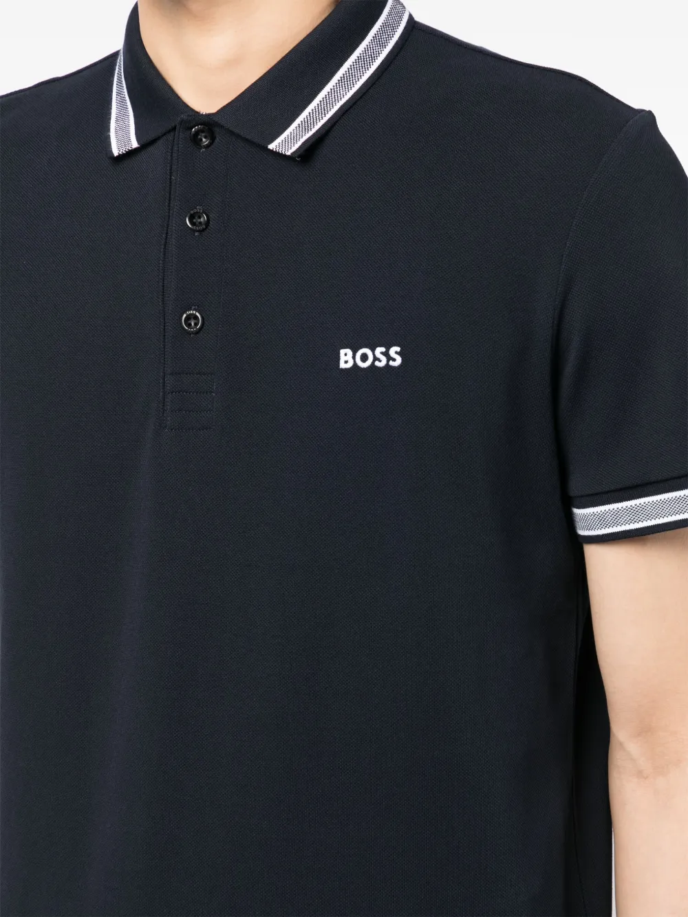 Темно-синий, хлопок, полосатые края, вышитый логотип на груди, воротник поло, планка на пуговицах спереди, короткие рукава и прямой подол.