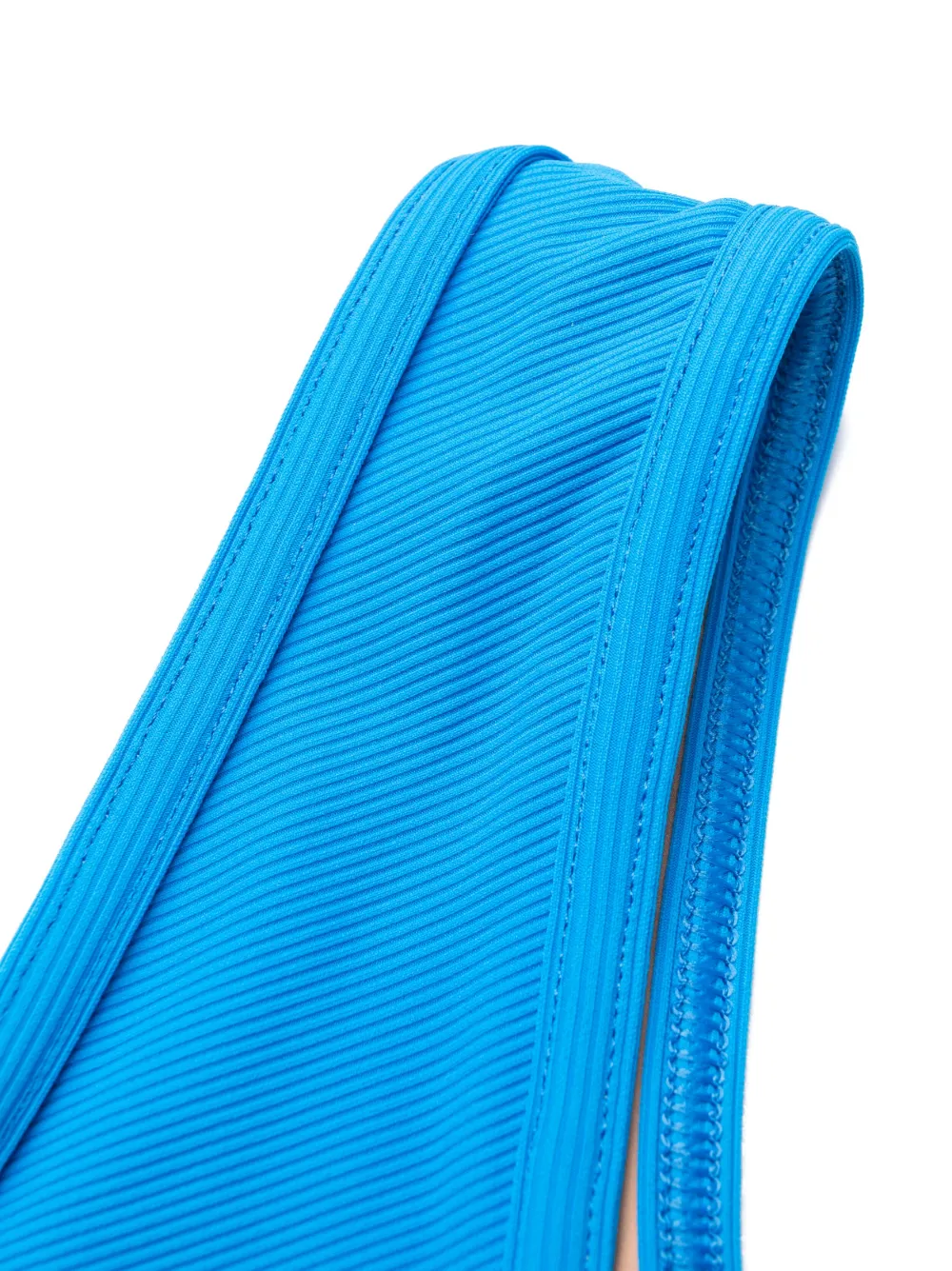 Синий, эластичный материал, трикотаж в рубчик, вырез-петля халтер, завязки вокруг шеи, застежка на завязке сзади, средняя посадка и завязки по бокам. Пожалуйста, примеряйте купальники и пляжные шорты только поверх собственного белья.