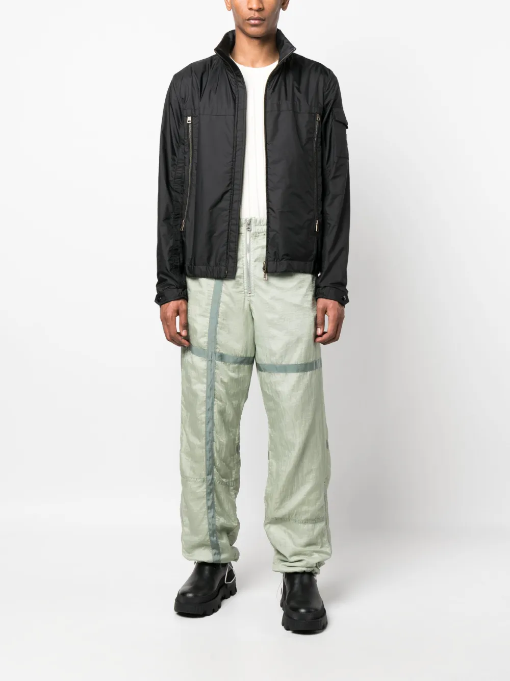 Серо-зеленый, эластичный пояс, застежка на молнии спереди, задние карманы с листочкой, широкий крой и молнии на манжетах.