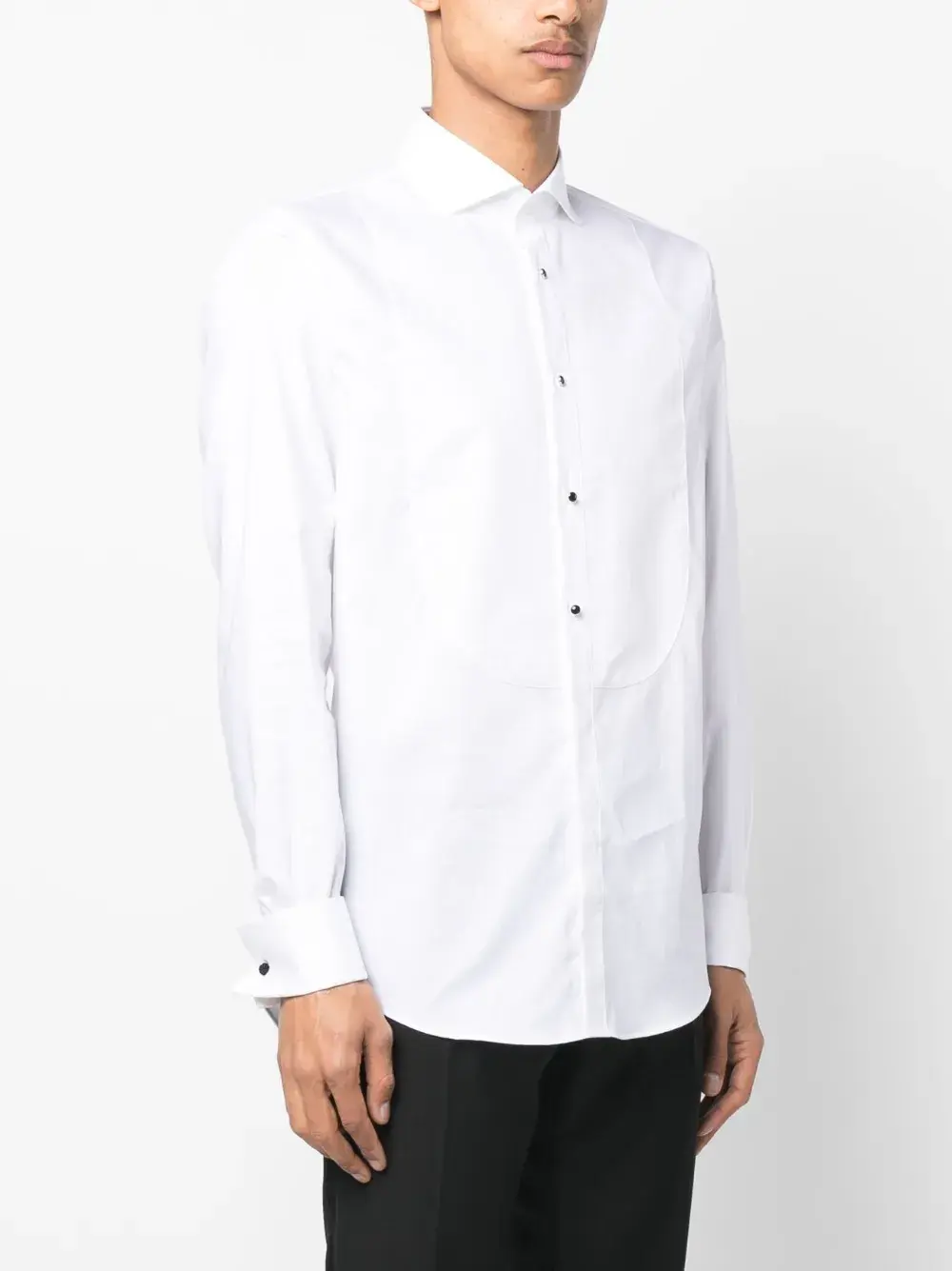Белый, хлопок, воротник-бабочка, застежка на пуговицах спереди, длинные рукава, манжеты на пуговицах и прямой подол.