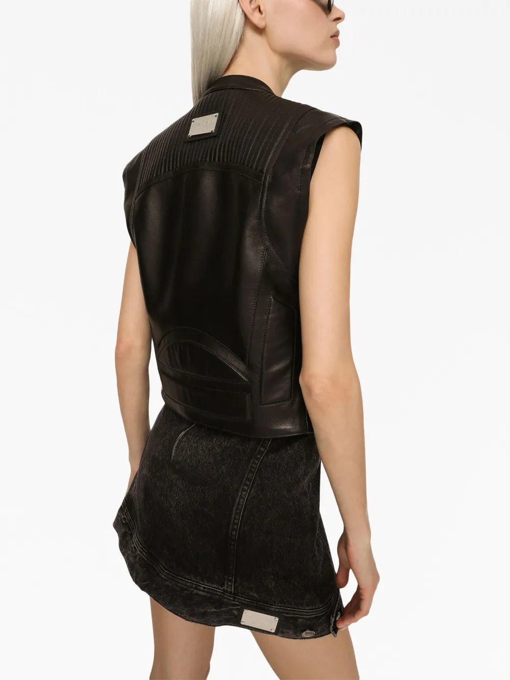 Черный, овечья кожа, серебристый металлический логотип, серебристая фурнитура, круглый вырез, застежка на молнии спереди, без рукавов, два нагрудных кармана на молнии и два кармана на молнии по бокам.