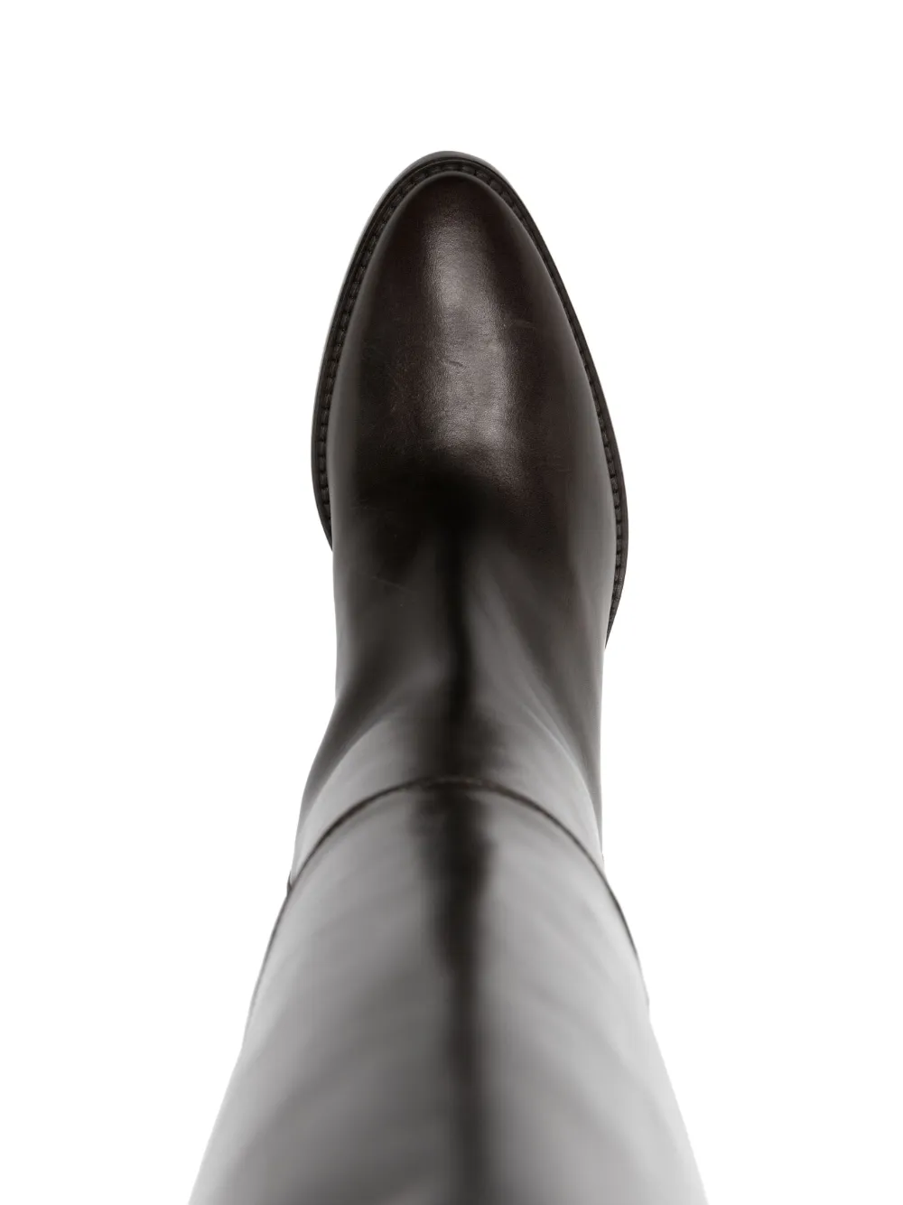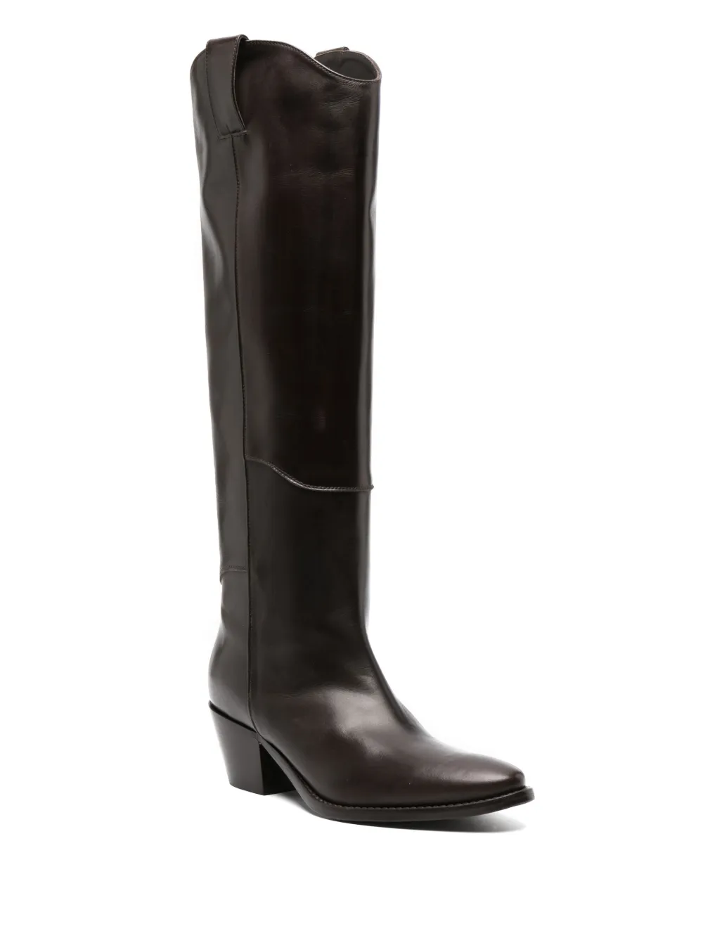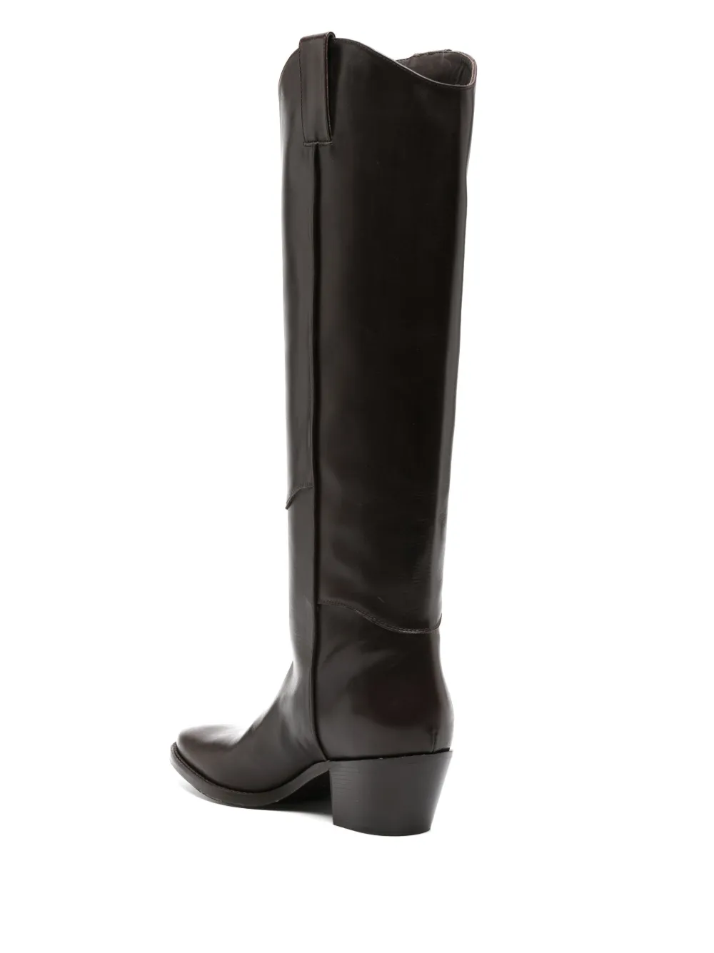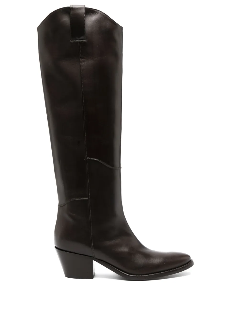 Кофейный, телячья кожа, миндалевидный носок, модель без застежки, гладкая текстура кожи, двойная петля для подтягивания, высота по колено и блочный каблук средней высоты.