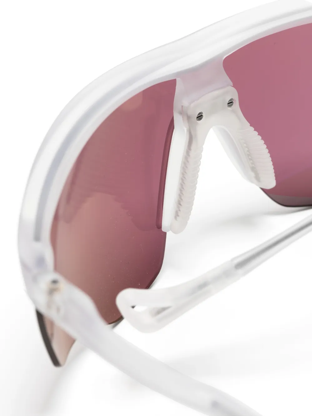 Белый, розовые линзы, оправа с боковой защитой, прозрачный материал, несколько оборотов, прямые дужки, дужки с закругленными концами и защита от ультрафиолетового излучения. В комплект входит защитный чехол для очков.