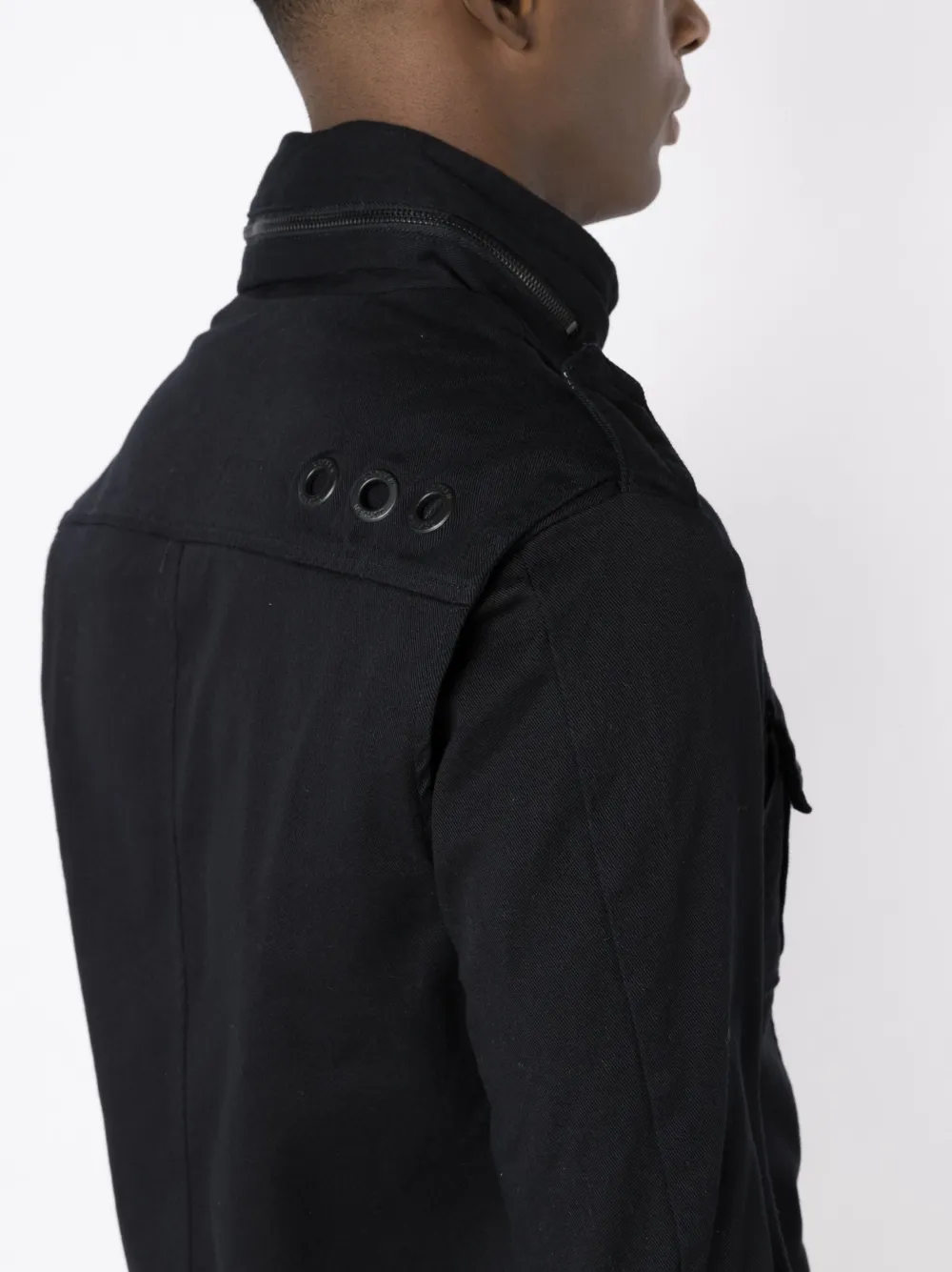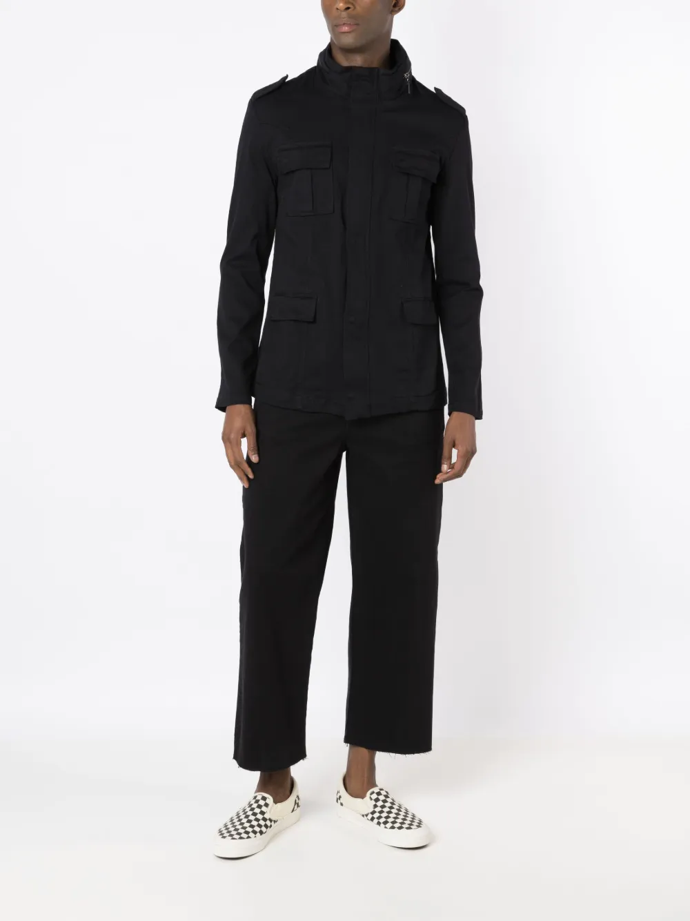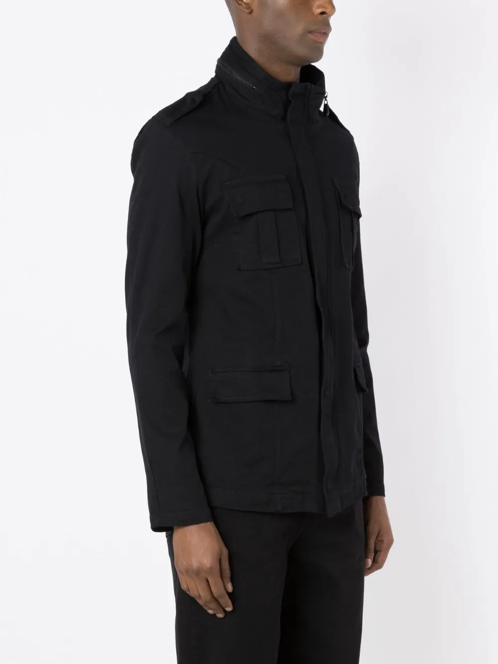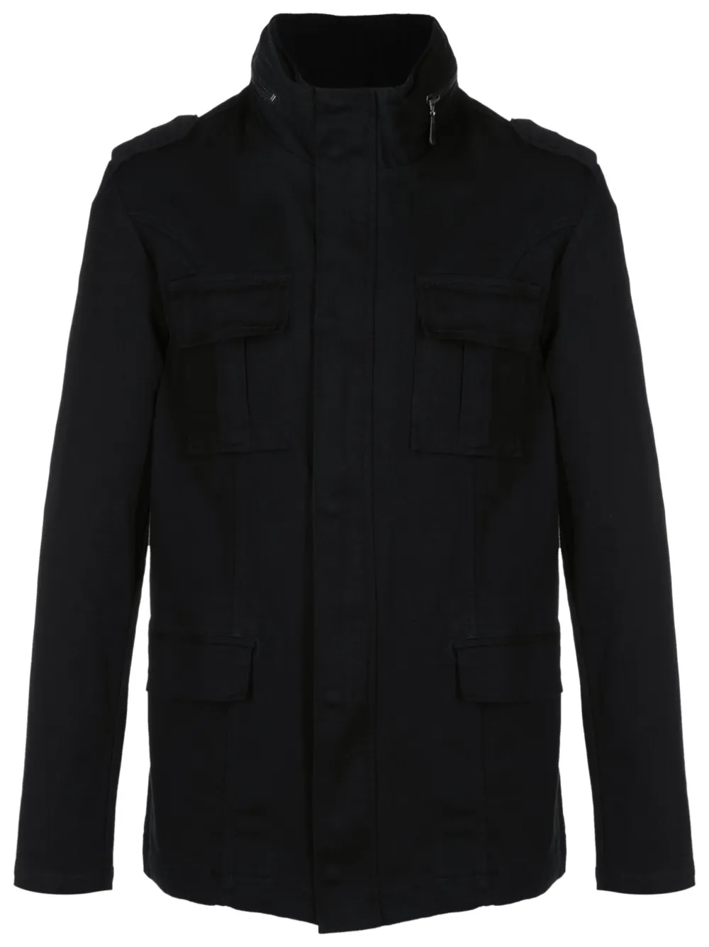 Вырез сзади, потайная застежка спереди, длинные рукава и четыре передних кармана с клапанами.