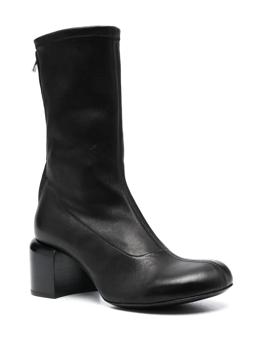 Черный, телячья кожа, строчка в тон, вставки, застежка на молнии сзади и высокий блочный каблук.