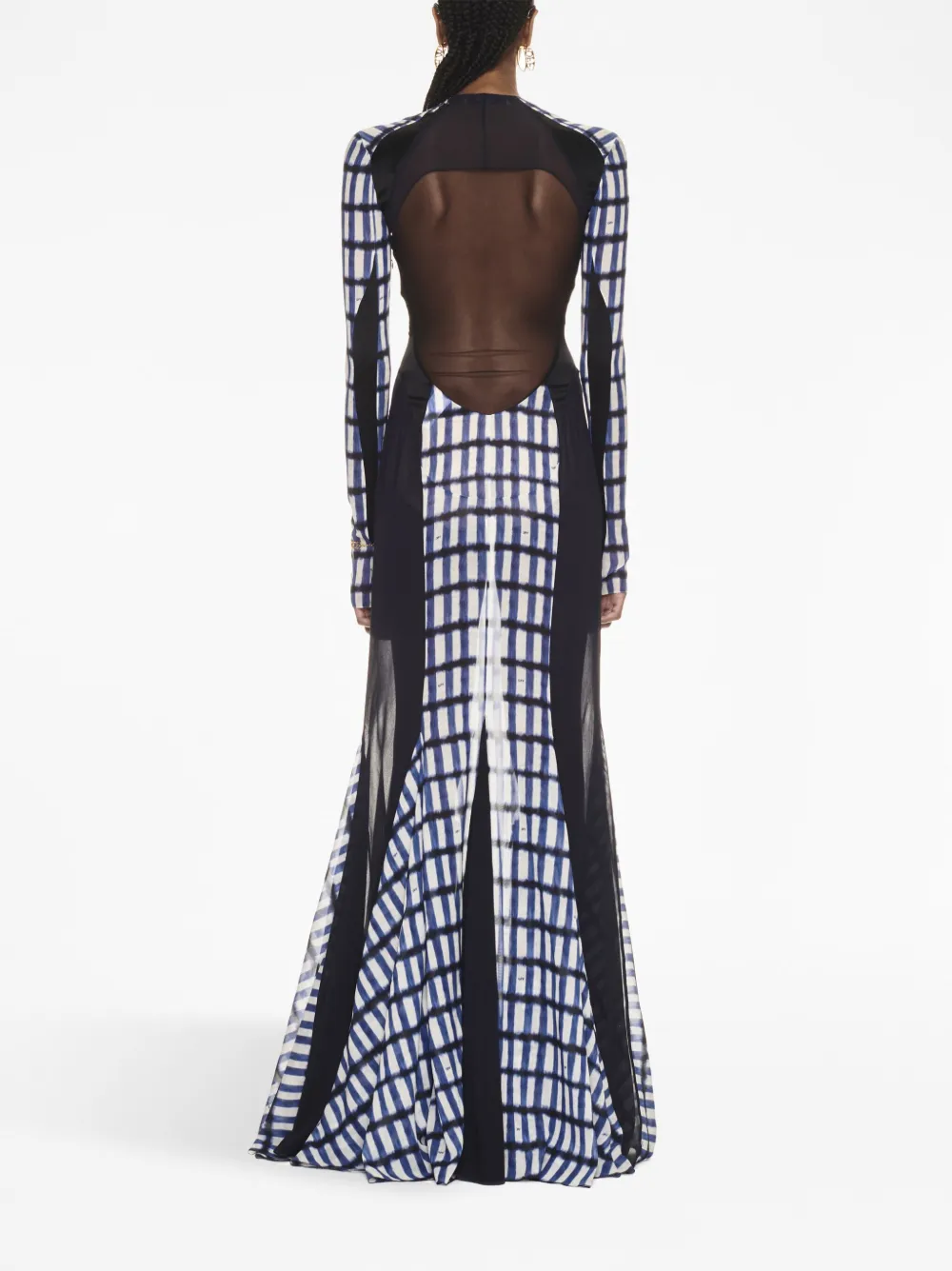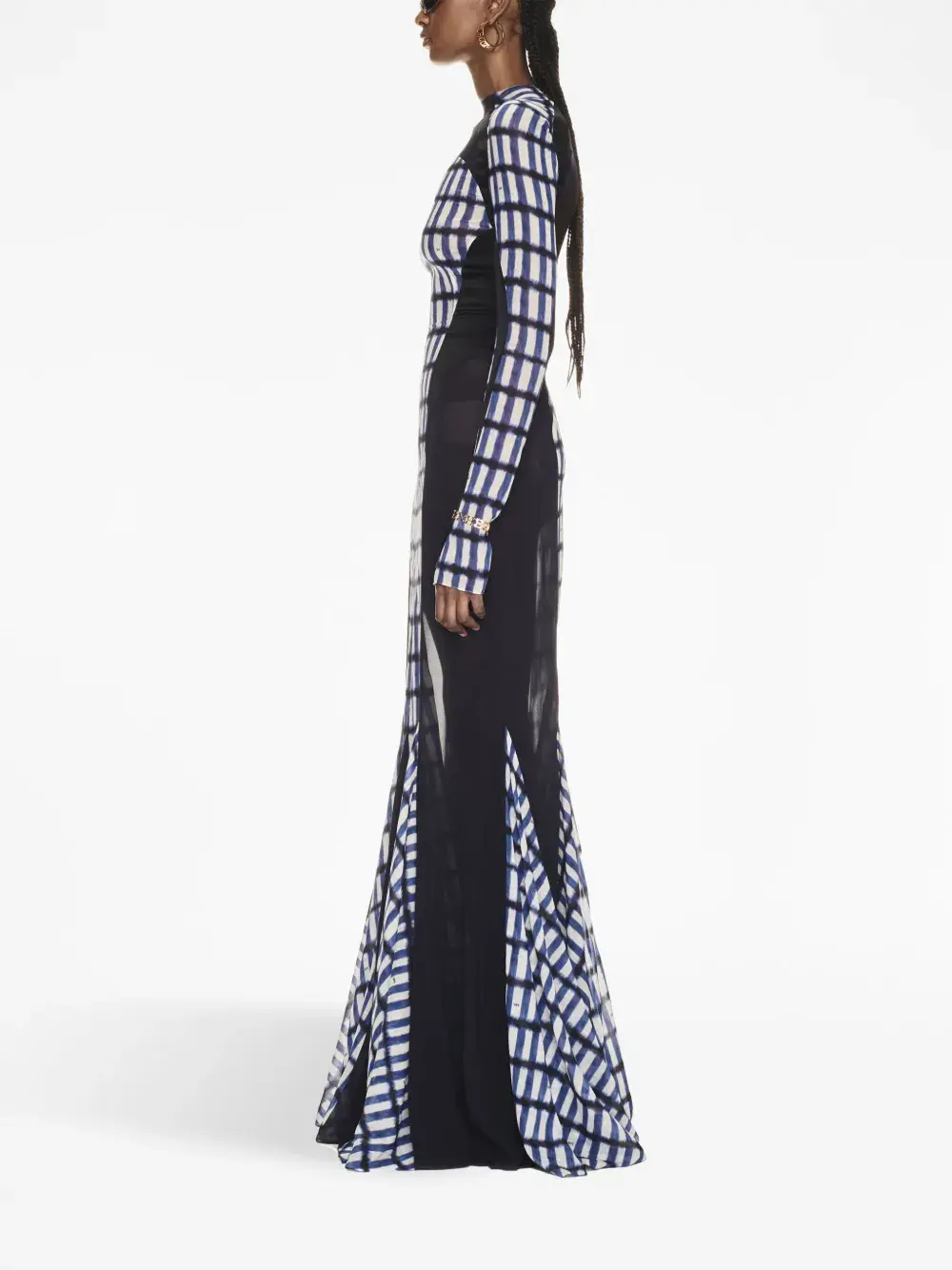 Смесовый шелк, геометричный принт, прозрачные вставки, круглый вырез, длинные рукава и длина макси.