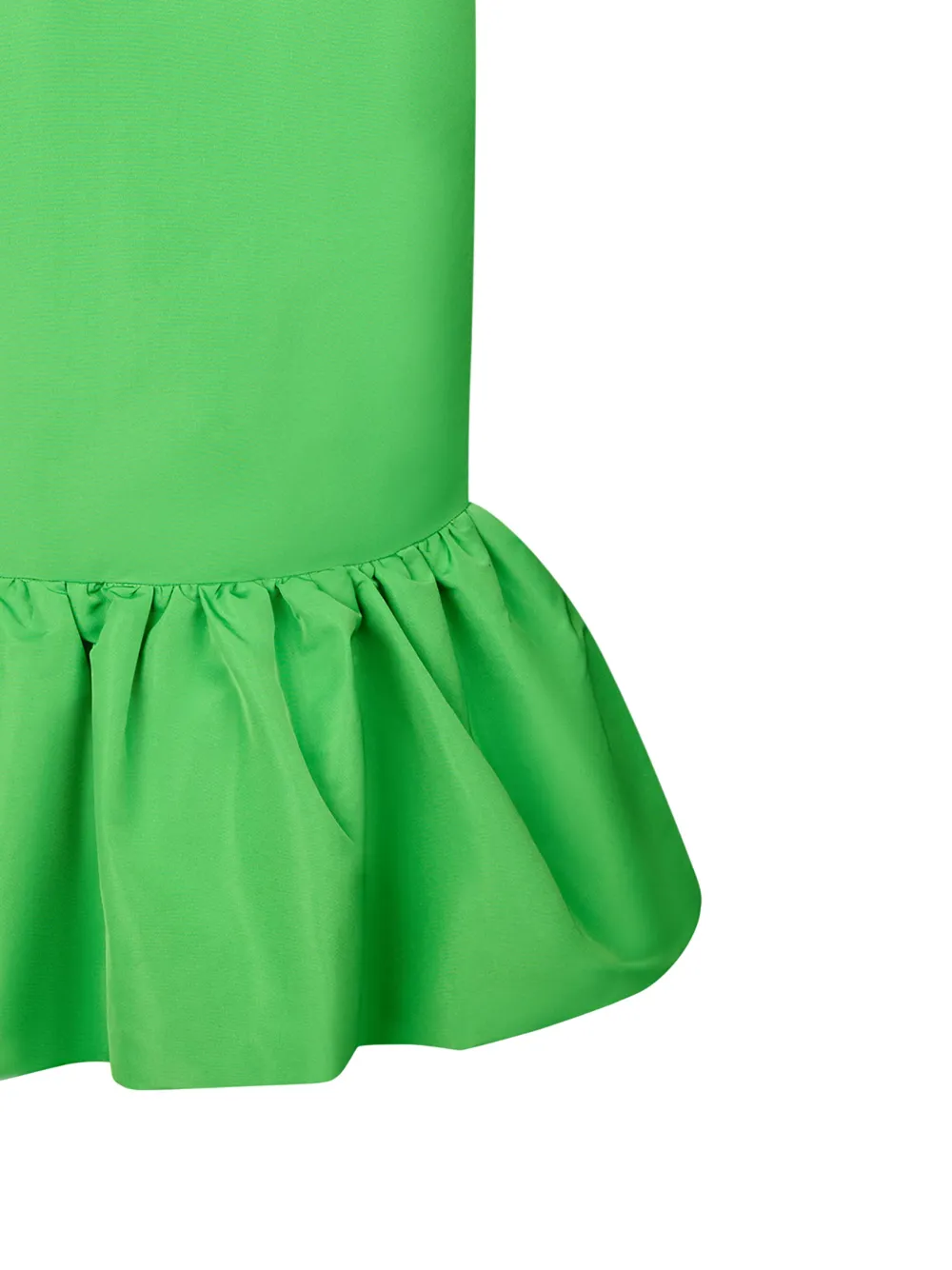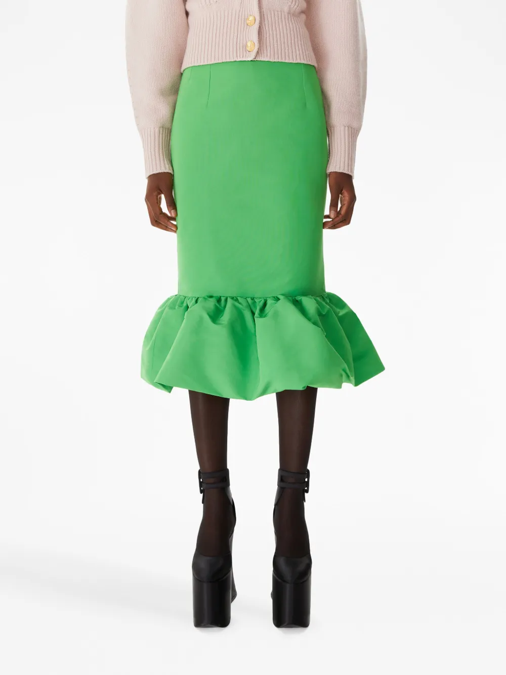 Изумрудно-зеленый, завышенная талия, застежка на молнии сзади, подол с баской и длина миди.