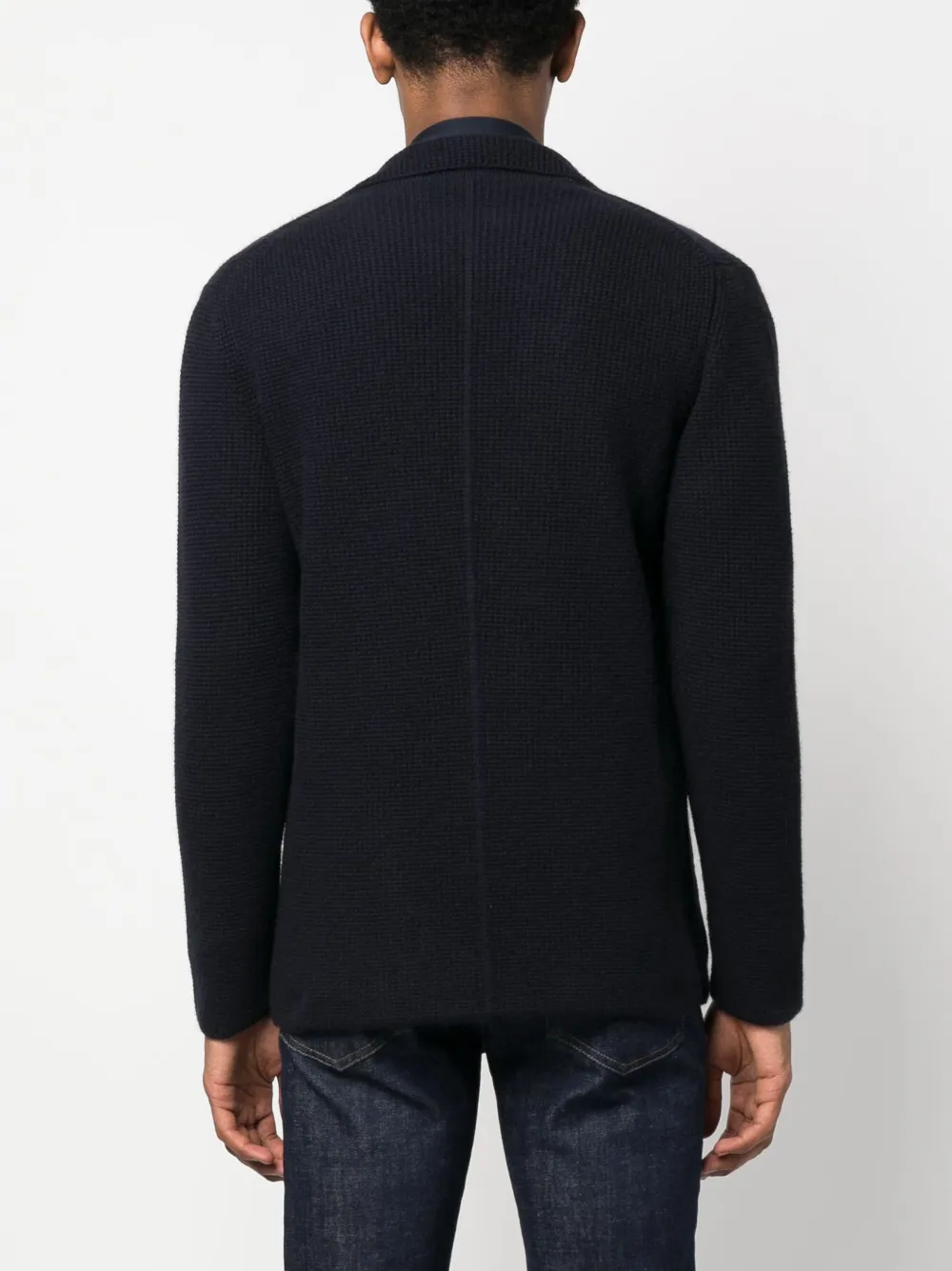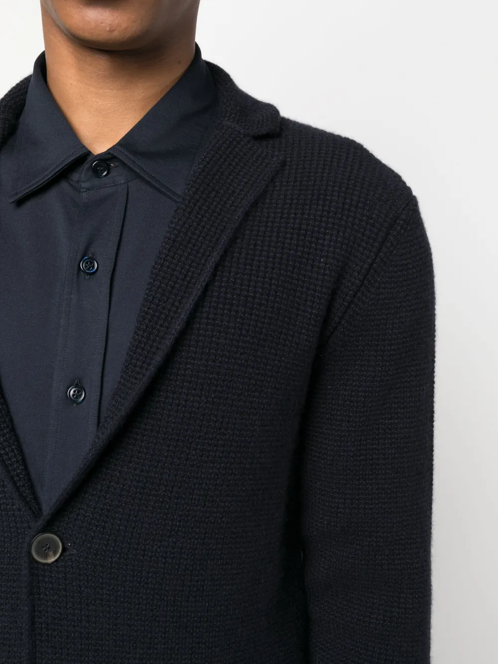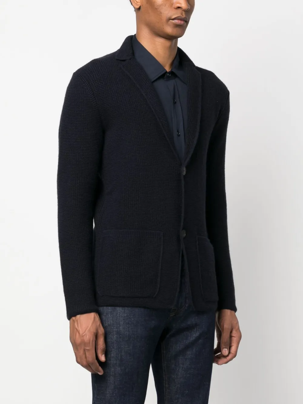 Темно-синий, смесь шерсти и кашемира, вафельная вязка, зазубренные лацканы, застежка на пуговицах спереди, длинные рукава, два накладных кармана спереди и прямой подол.