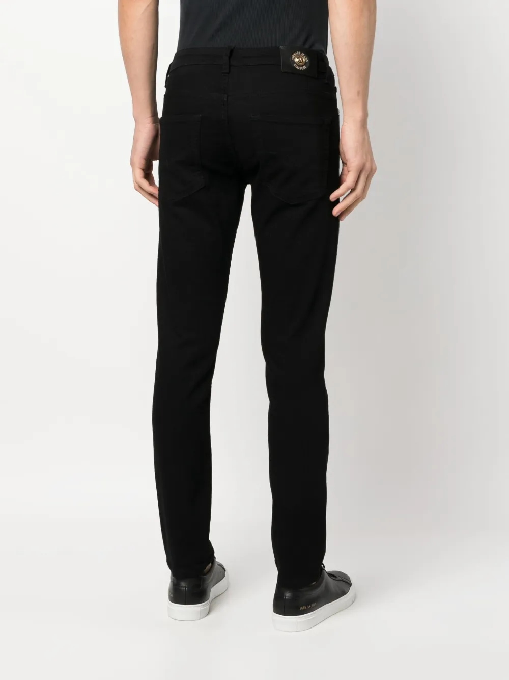 Черный, эластичный хлопок, нашивка с логотипом сбоку, петли для ремня, застежка на молнии и пуговице спереди, зауженный крой и пять карманов.