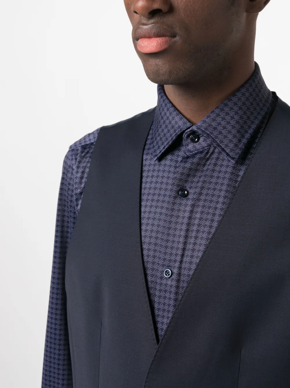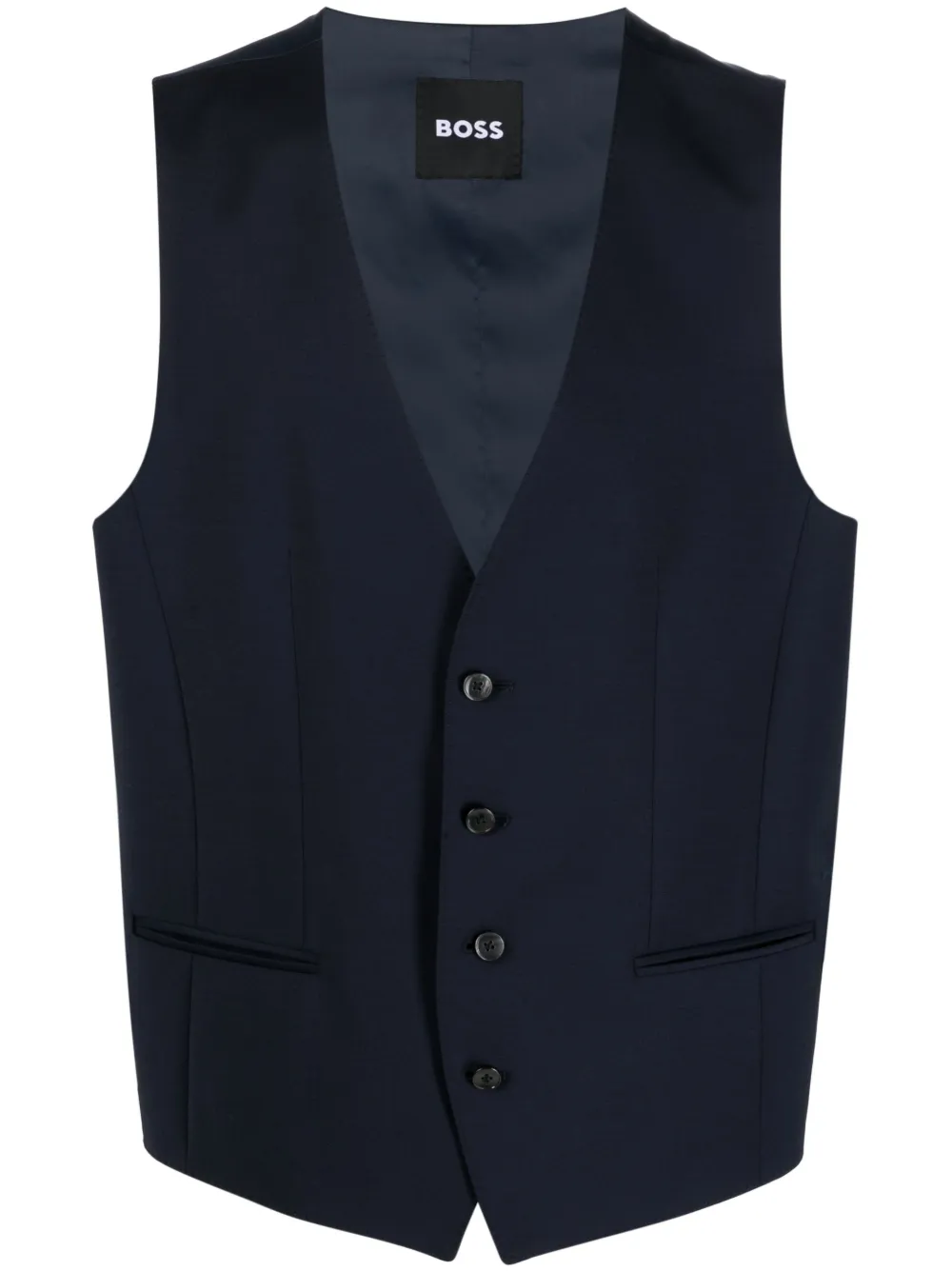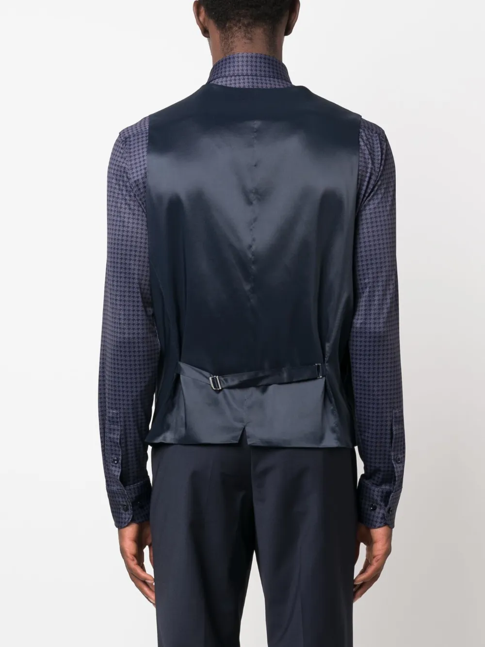 Темно-синий, смесовая необработанная шерсть, глубокий V-образный вырез, без рукавов, застежка на пуговицах спереди, два прорезных кармана спереди и регулируемый ремешок сзади.