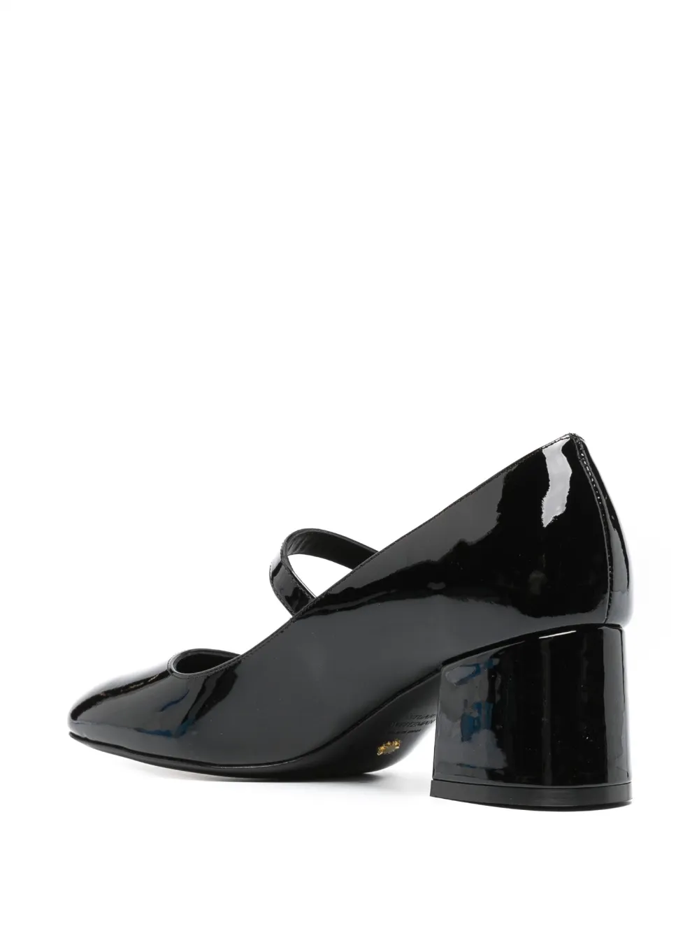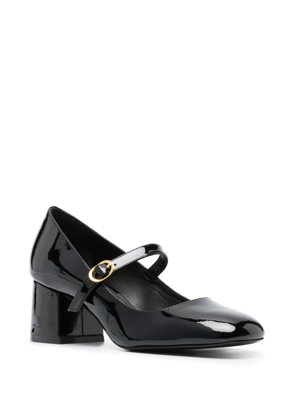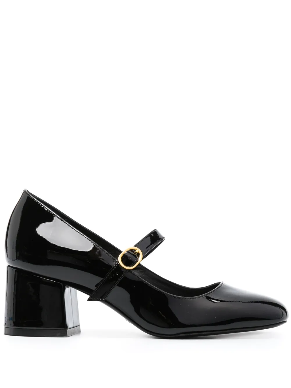 Черный, телячья кожа, лакированная отделка, закругленный носок, застежка на пряжке, кожаная стелька с логотипом и блочный каблук средней высоты.