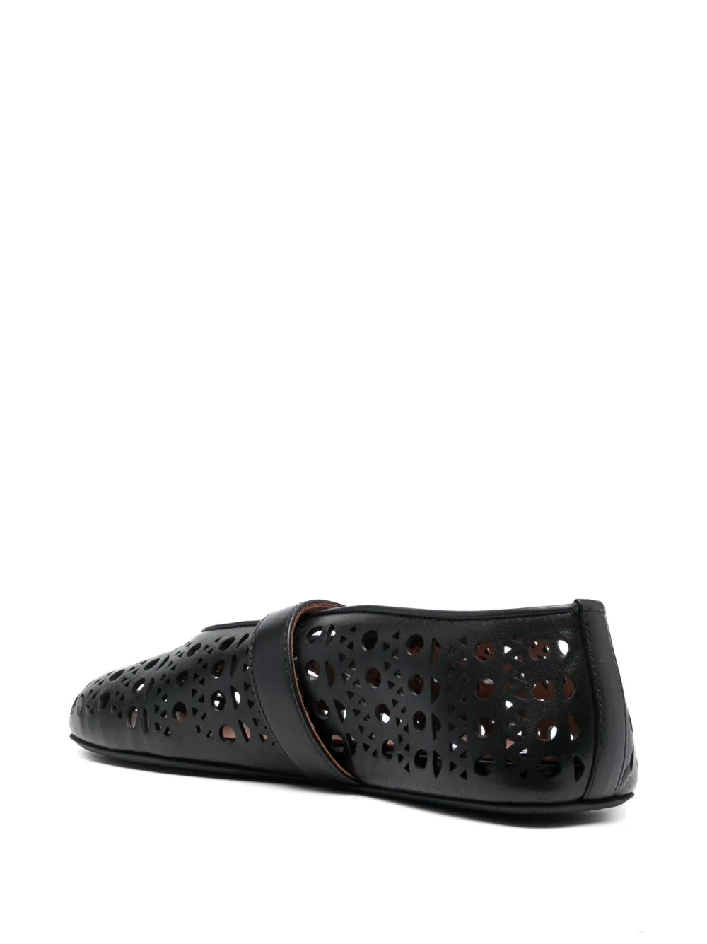 Черный, овечья кожа, вырезные детали, застежка на пряжке, серебристая фурнитура, закругленный носок и плоская резиновая подошва.