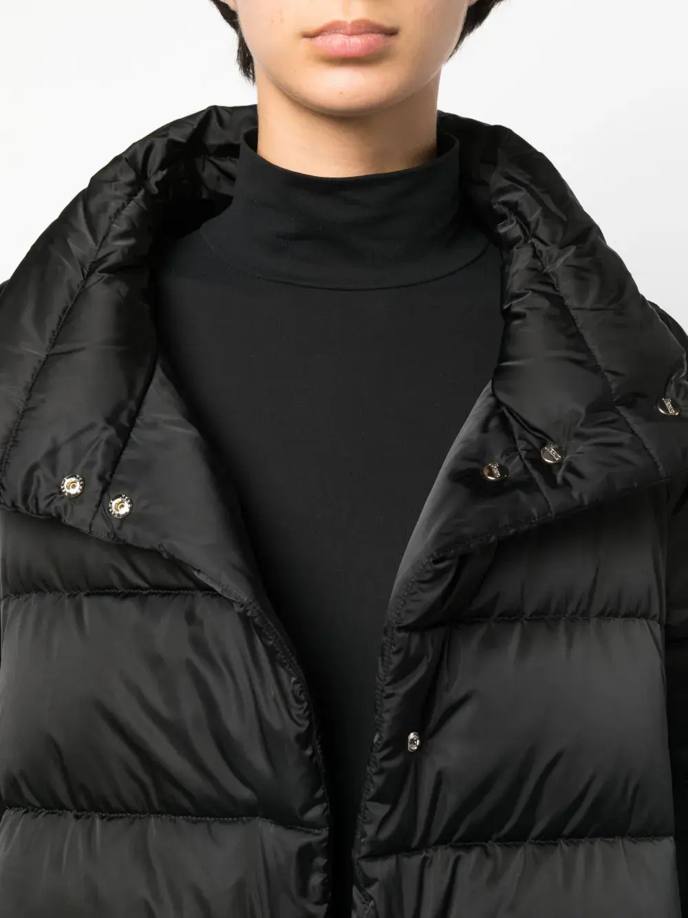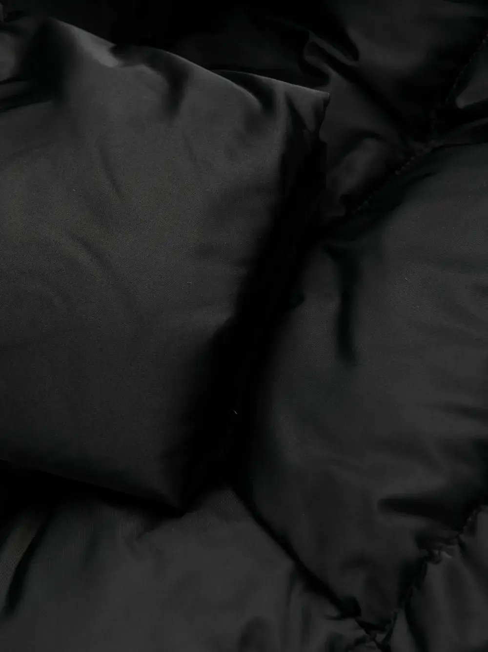 Черный, наполнитель из смеси пуха и пера, дутый материал, принт с логотипом сзади, съемный капюшон, воротник-труба, застежка на кнопках спереди, двусторонняя молния спереди, длинные рукава, вырезы для больших пальцев, два кармана на молнии по бокам и подол с кулиской.