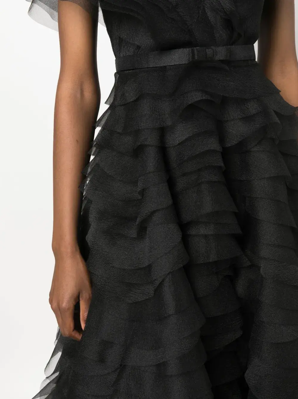 Черный, модель с оборками, U-образный вырез, застежка на завязке сзади, короткие рукава, высота по щиколотку и прямой подол.