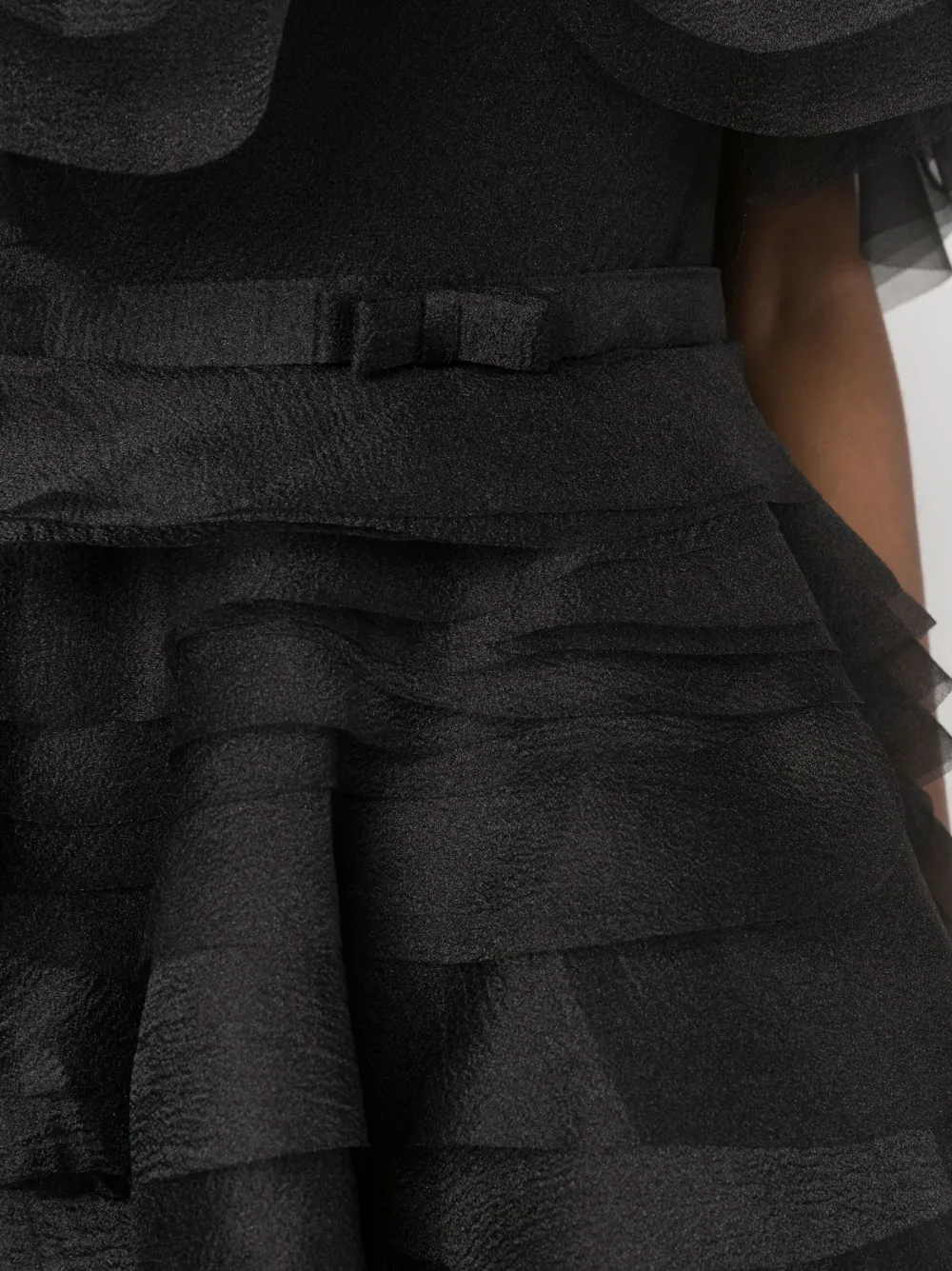 Черный, органза, открытые плечи, верх в корсетном стиле, модель с оборками, застежка на молнии сзади и длина до бедер.