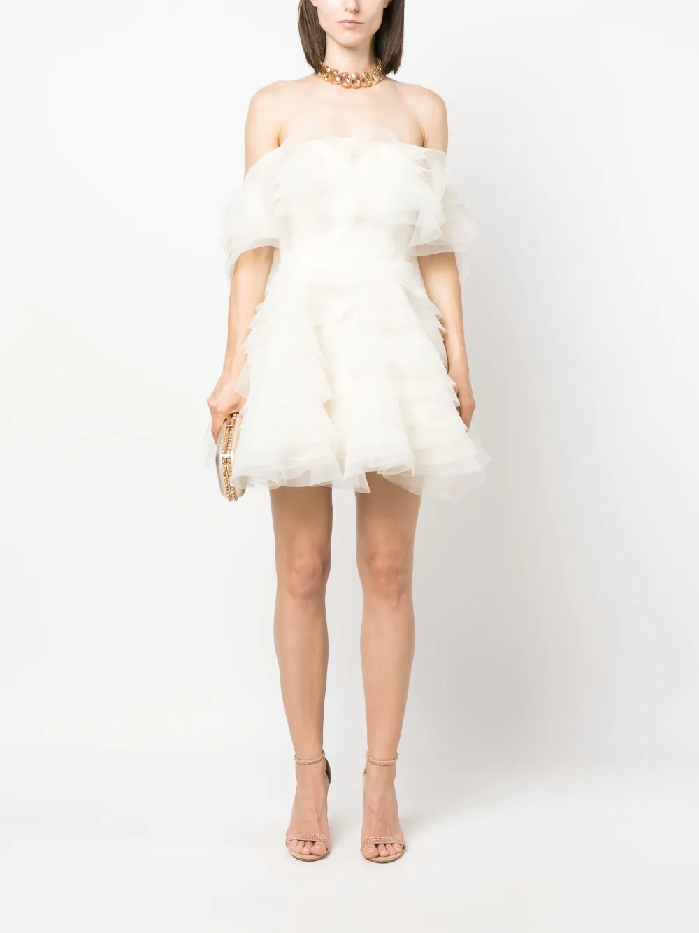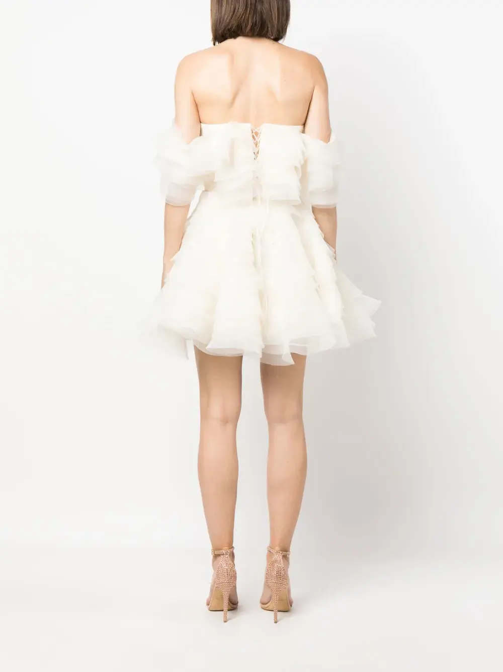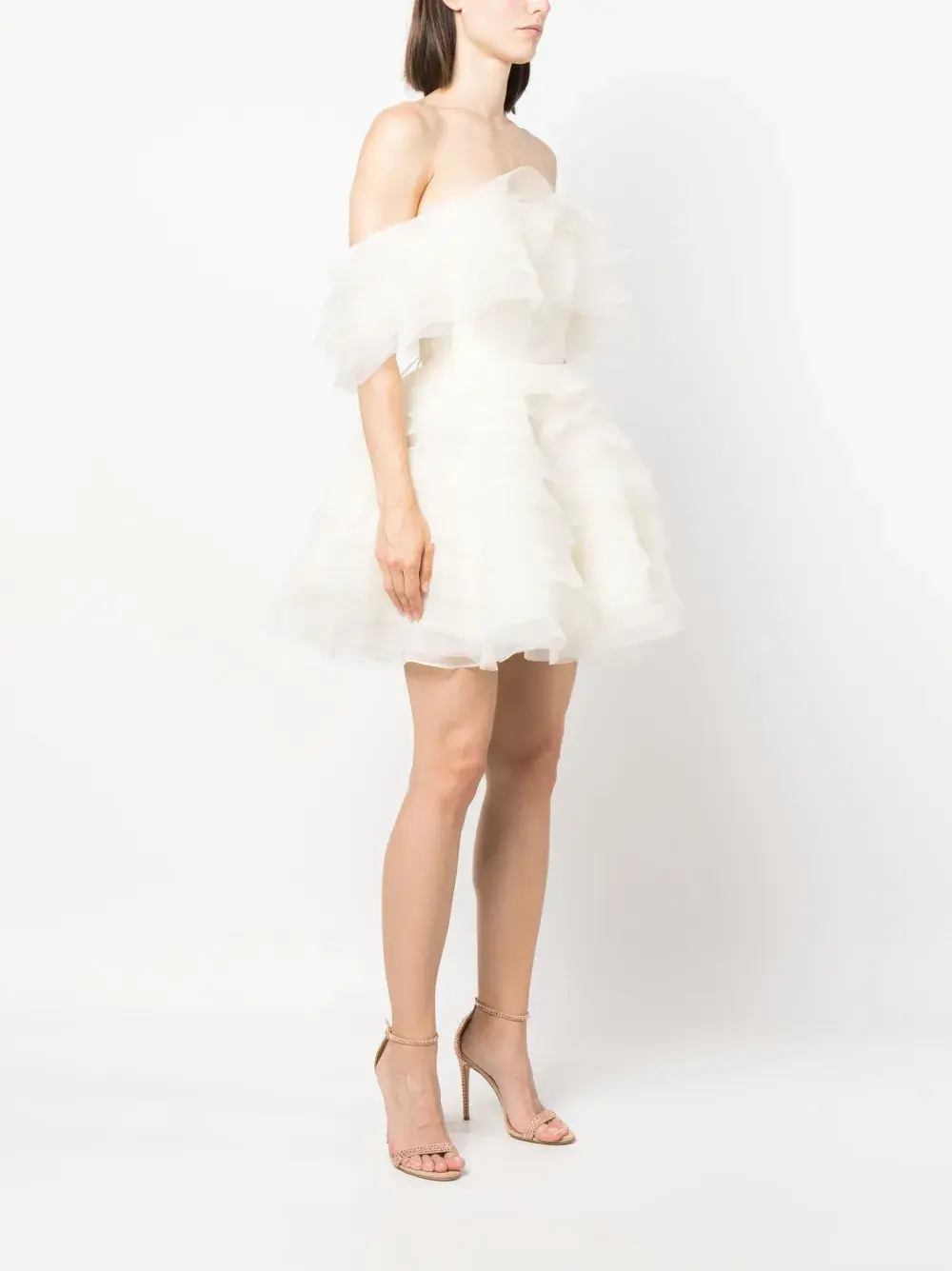 Цвет слоновой кости, открытые плечи, органза, верх в корсетном стиле, застежка на молнии сзади, модель с оборками и длина до бедер.