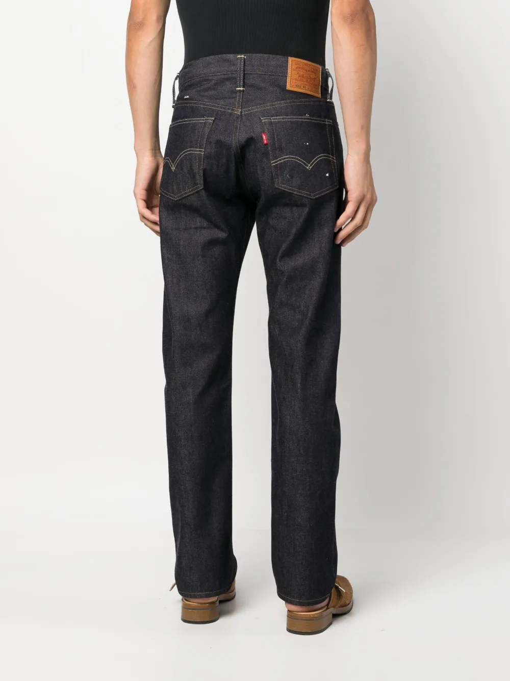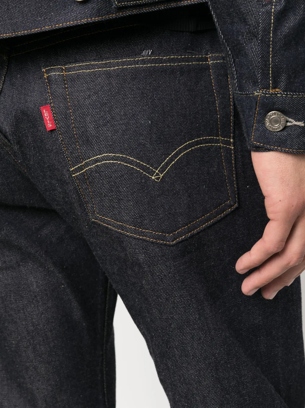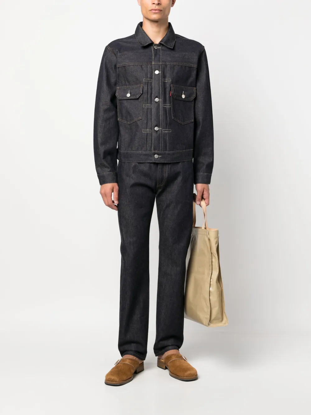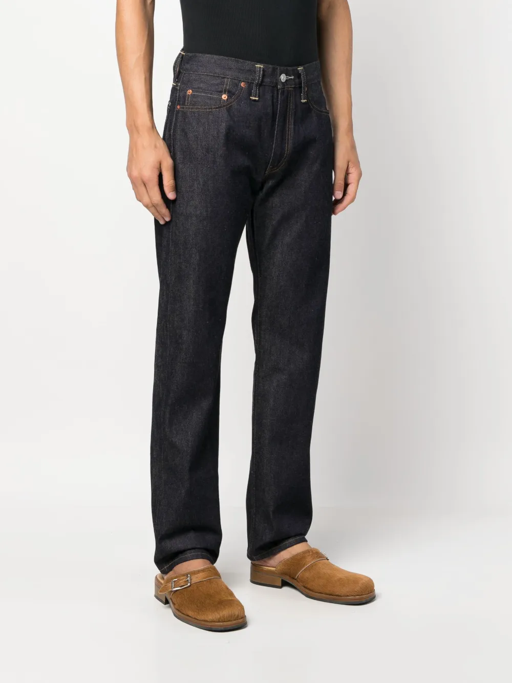 Индиго, хлопок, деним, нашивка с логотипом сзади, контрастная строчка, средняя посадка, петли для ремня, ширинка на пуговицах, широкий крой и пять карманов.