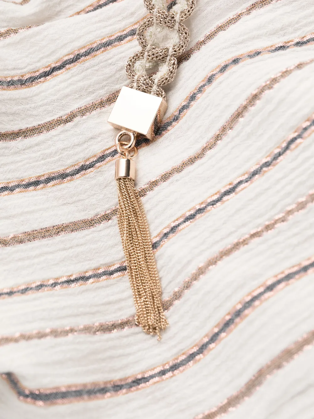 Цвет слоновой кости, смесовый хлопок, вставки из люрекса, застежка на пуговицах спереди, два вшитых кармана по бокам, короткие рукава, потайная застежка на молнии сзади и длинная модель.