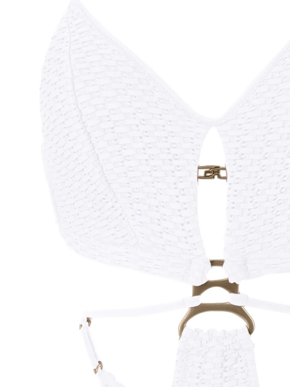 Белый, переплетенный дизайн, V-образный вырез, тонкие бретели и застежка на зажиме сзади. Пожалуйста, примеряйте купальники и пляжные шорты только поверх собственного белья.