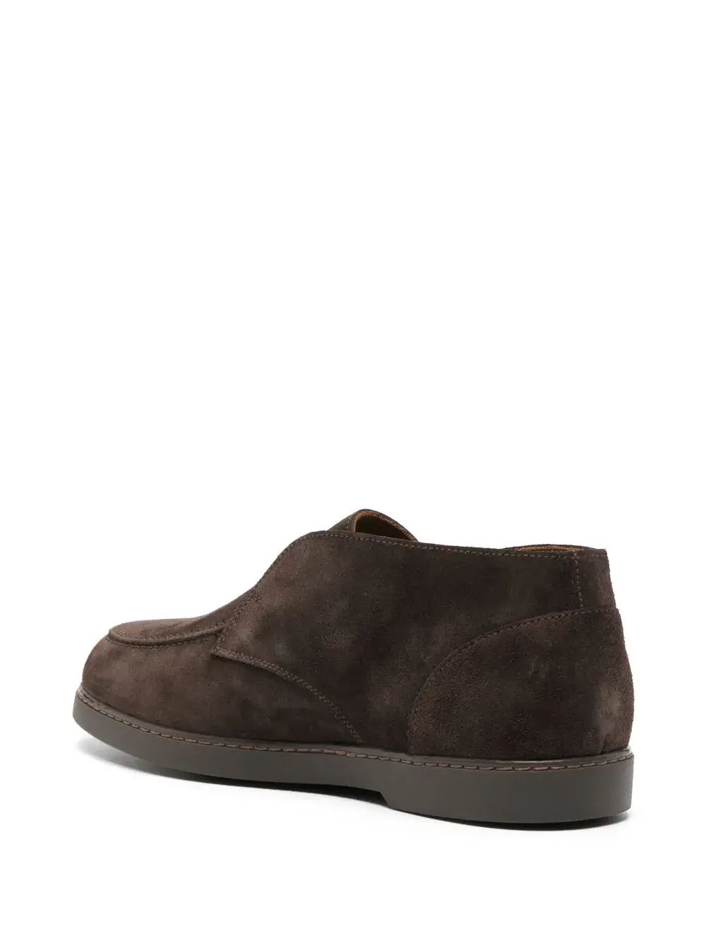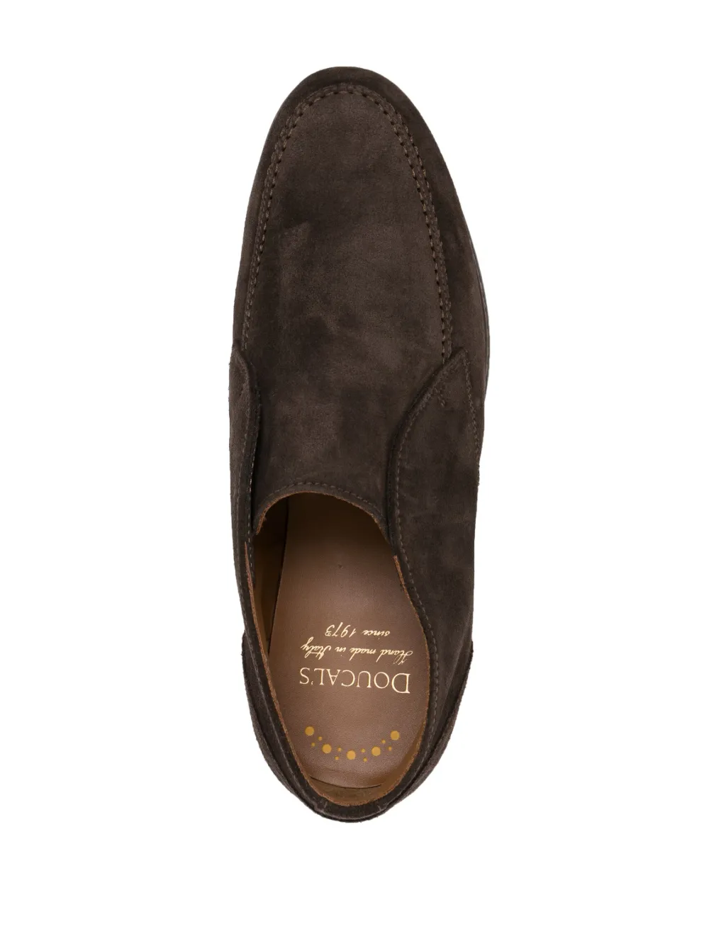 Шоколадный, замша из телячьей кожи, вставки, закругленный носок, модель без застежки, стелька с логотипом и резиновая подошва.
