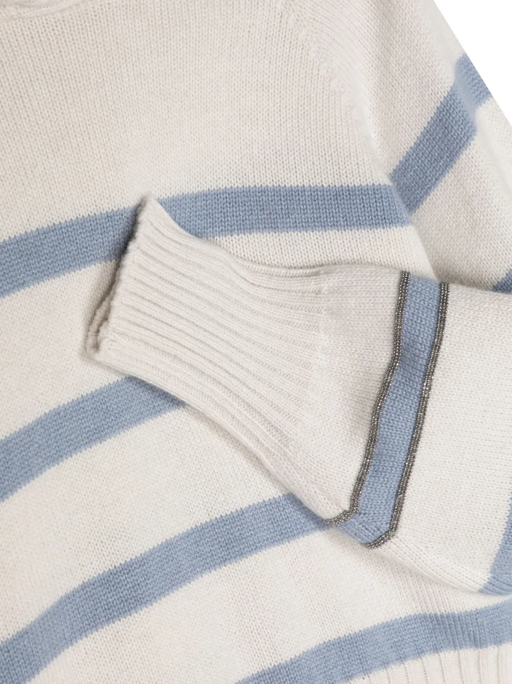 Белый, голубой, кашемир, узор в горизонтальную полоску, тонкая вязка, люрекс, классический капюшон, рукава реглан и прямой подол.