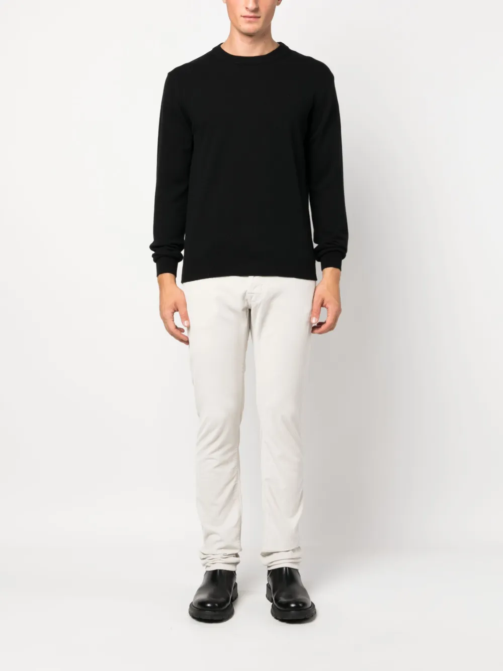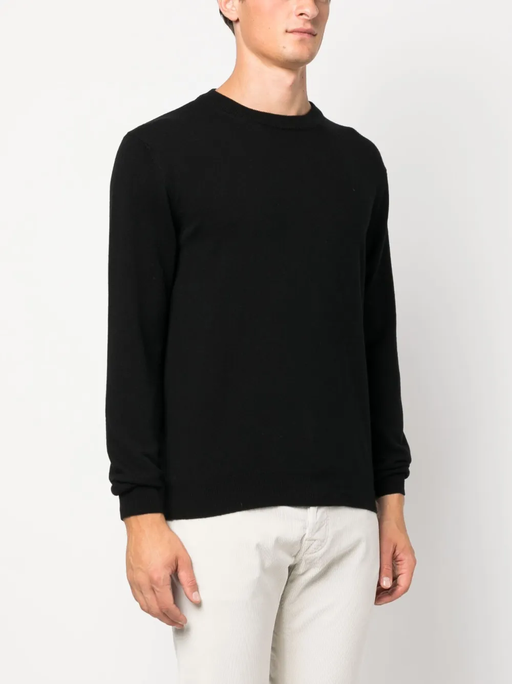 Черный, смесь кашемира и шелка, тонкая вязка, серебристый металлический логотип, круглый вырез и длинные рукава.