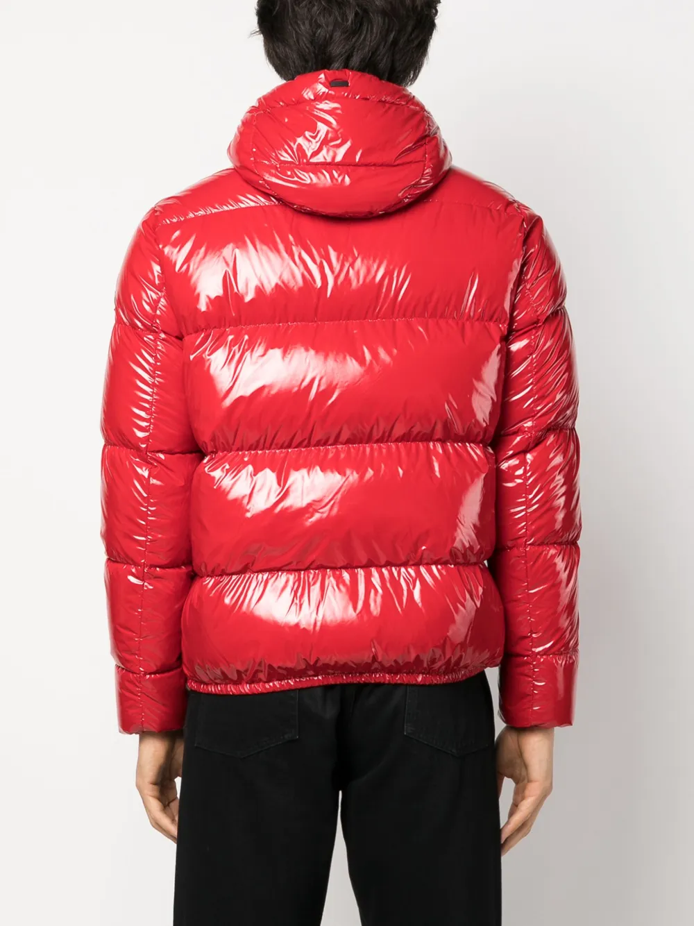 Красный, наполнитель из пуха и перьев, дутый материал, классический капюшон, нашивка с логотипом на рукаве, застежка на молнии спереди, длинные рукава, два кармана на молнии по бокам и прямой подол.