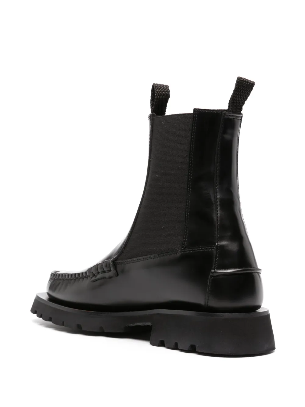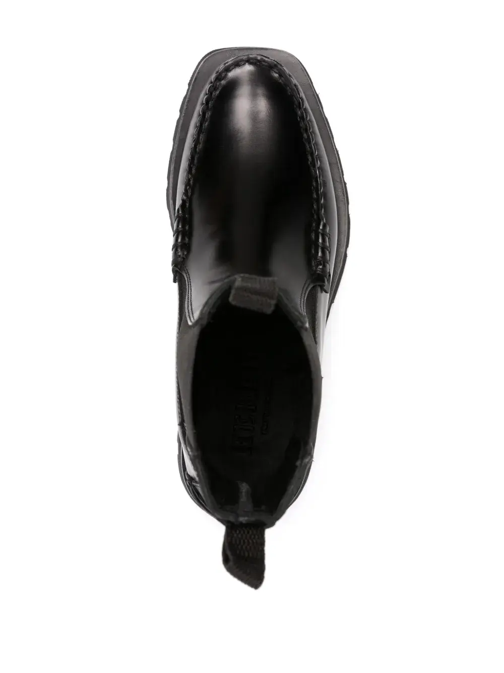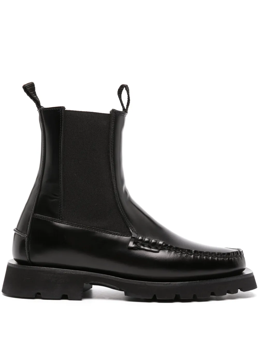 Черный, телячья кожа, двойная петля для подтягивания, эластичные боковые вставки, квадратный носок, модель без застежки и низкий блочный каблук.
