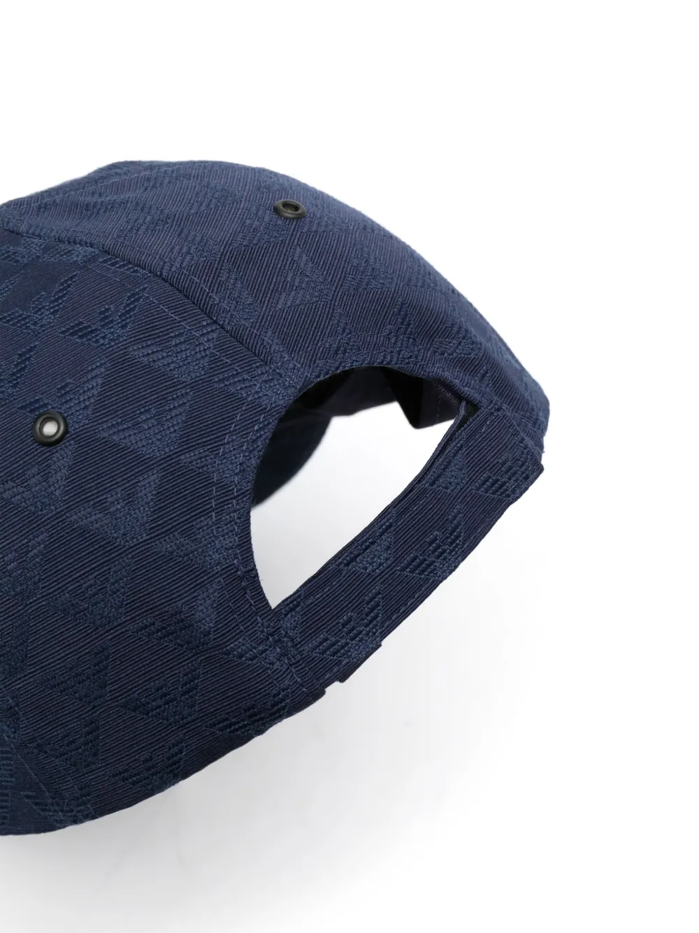 Темно-синий, хлопок, закругленный козырек, узор с изображением монограммы и застежка на липучке сзади.