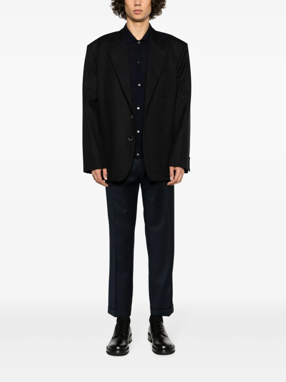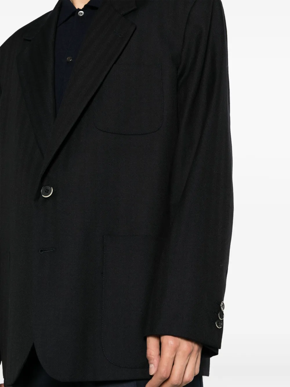 Темно-синий, необработанная шерсть, узор в вертикальную полоску, однотонная расцветка, зазубренные лацканы, застежка на пуговицах спереди, длинные рукава, манжеты на пуговицах и три накладных кармана спереди.