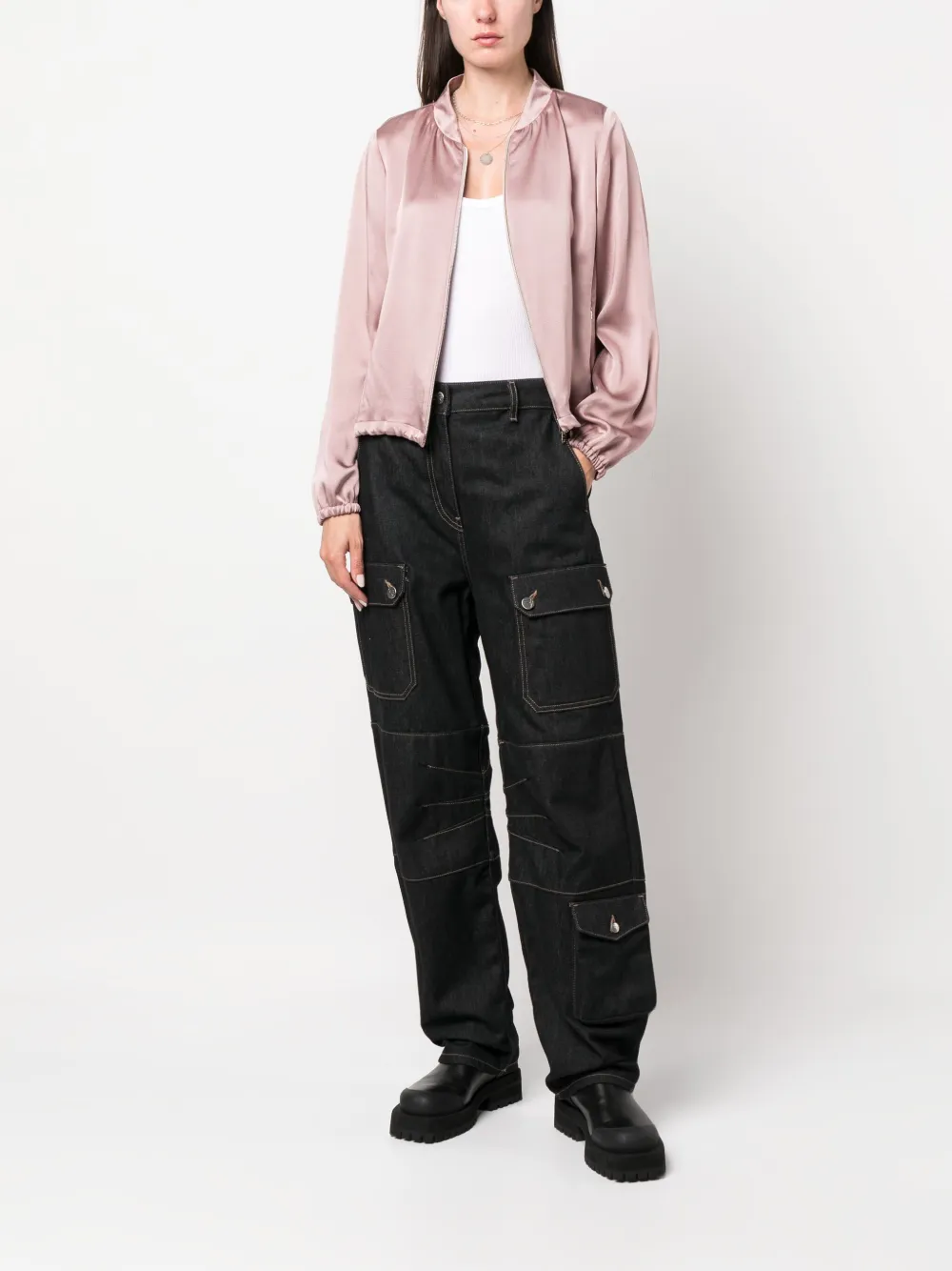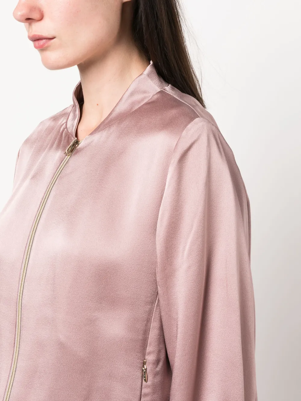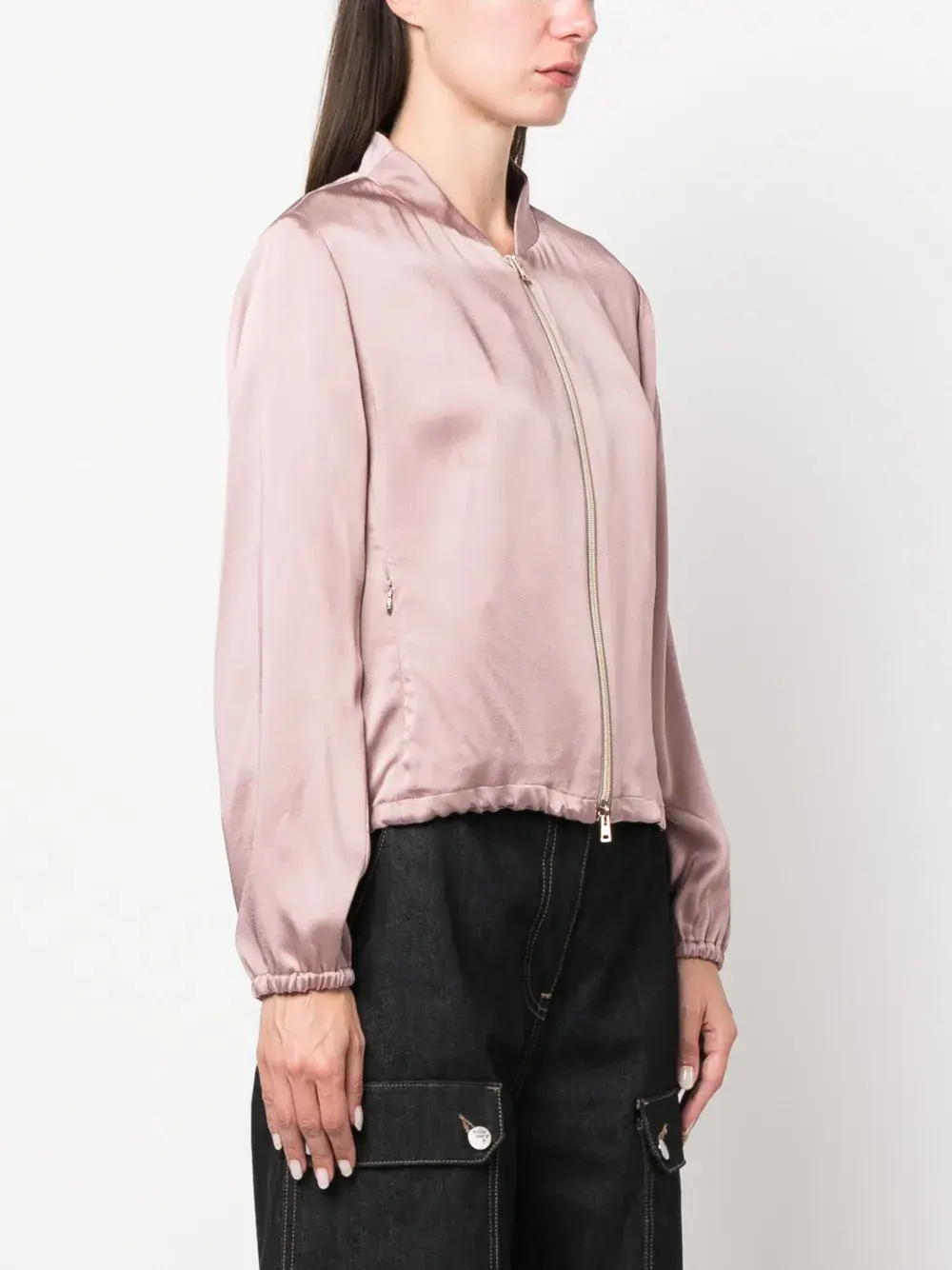 Светло-розовый, воротник-стойка, застежка на молнии спереди, золотистая фурнитура, длинные рукава, эластичные манжеты, эластичный подол и два кармана на молнии по бокам.
