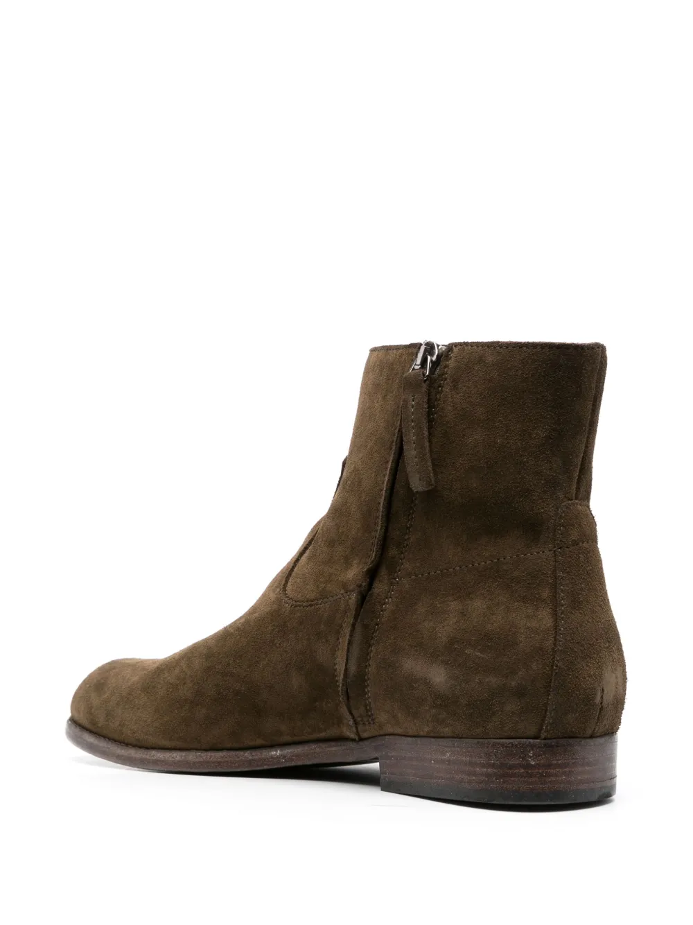 Хаки, замша из телячьей кожи, закругленный носок, застежка на молнии сбоку, кожаная стелька с логотипом и плоская кожаная подошва.