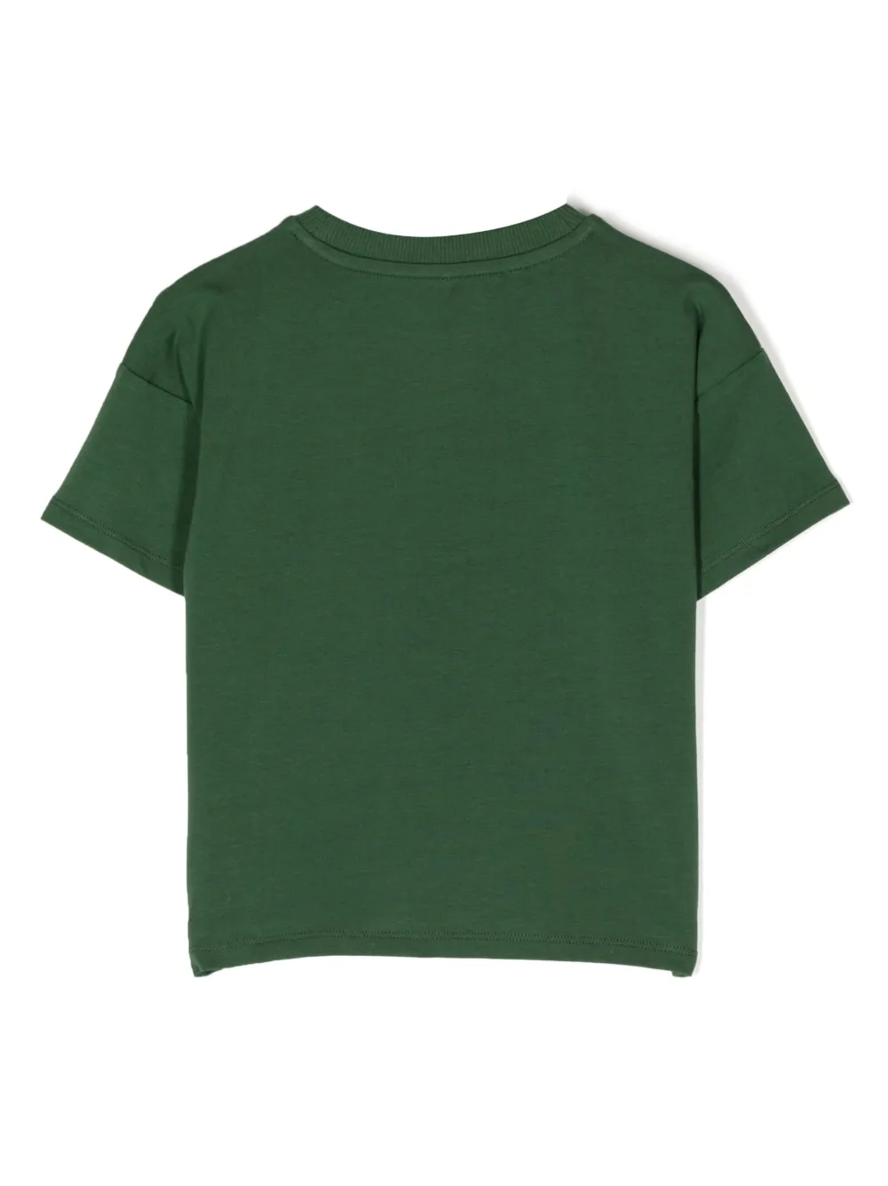 Темно-зеленый, стрейчевый органический хлопок, принт с надписью спереди, круглый вырез, приспущенные плечи, короткие рукава и прямой подол. Узнать больше о том, какие товары получают отметку «Ответственный выбор», можно из материала «Как мы оцениваем экологичность и этичность».