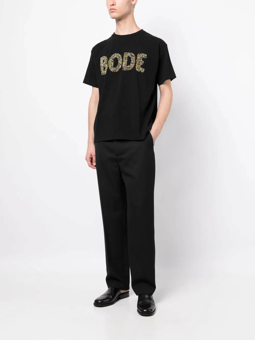 Черный, хлопок, декор из бисера, логотип, круглый вырез, короткие рукава и прямой подол.